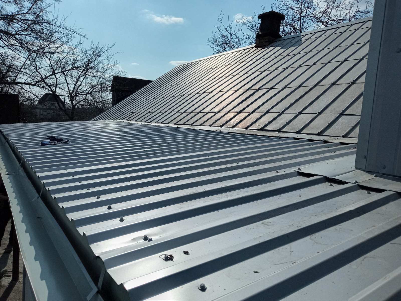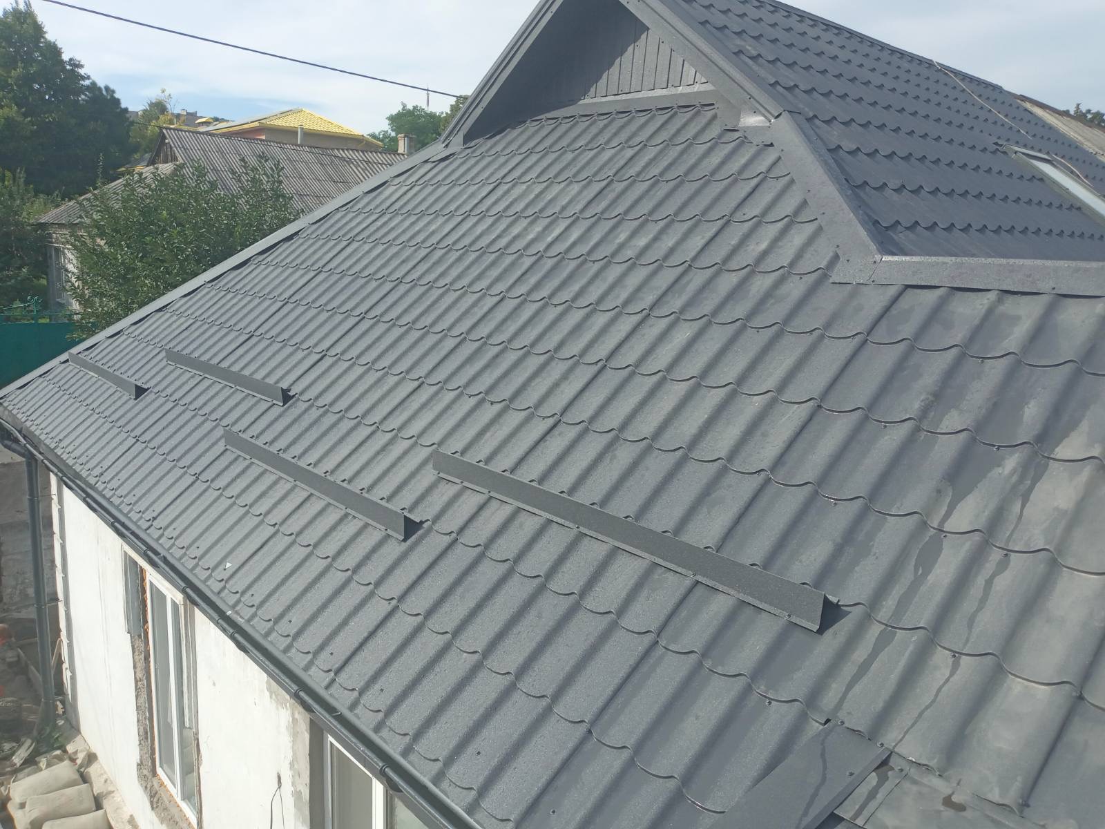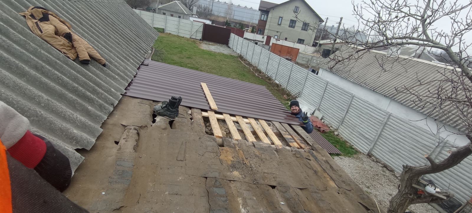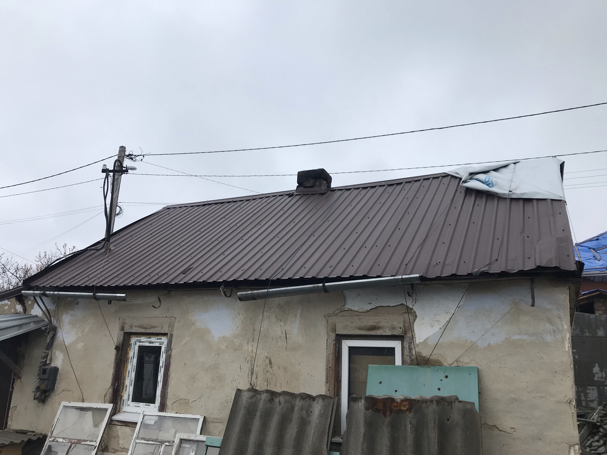 Кровля крыши частного дома. Покрытие кровли металлочерепицей: демонтаж шифера, демонтаж старой обрешётки, ремонт стропильной системы, устройство перекрытия на пристройке к дому, монтаж гидроизоляции, монтаж новой обрешётки, монтаж металлочерепицы, монтаж свесов кровли, монтаж водосточной системы. Общая площадь кровли 154 м 2. (Днепр, АНД район). Март, 2023 год