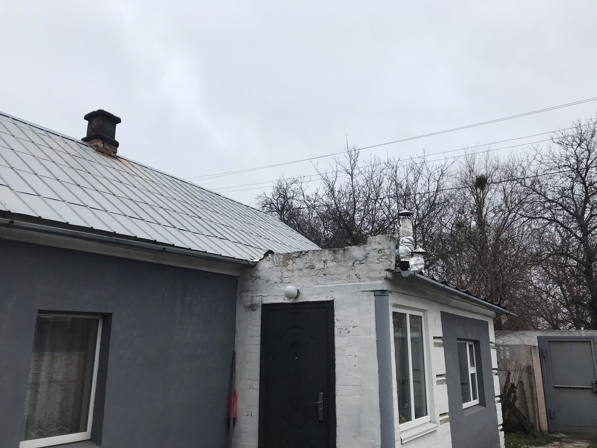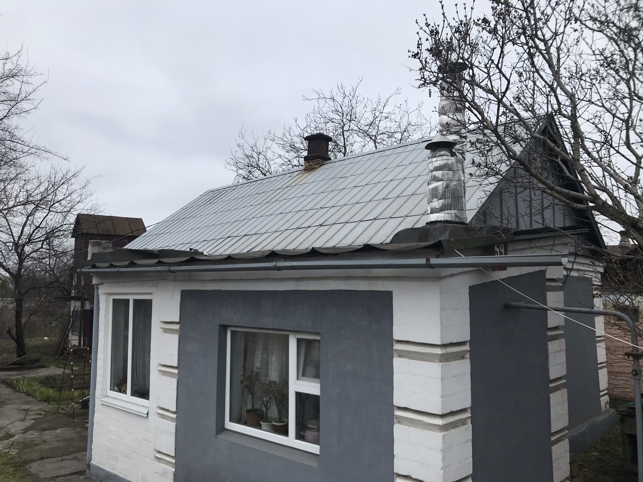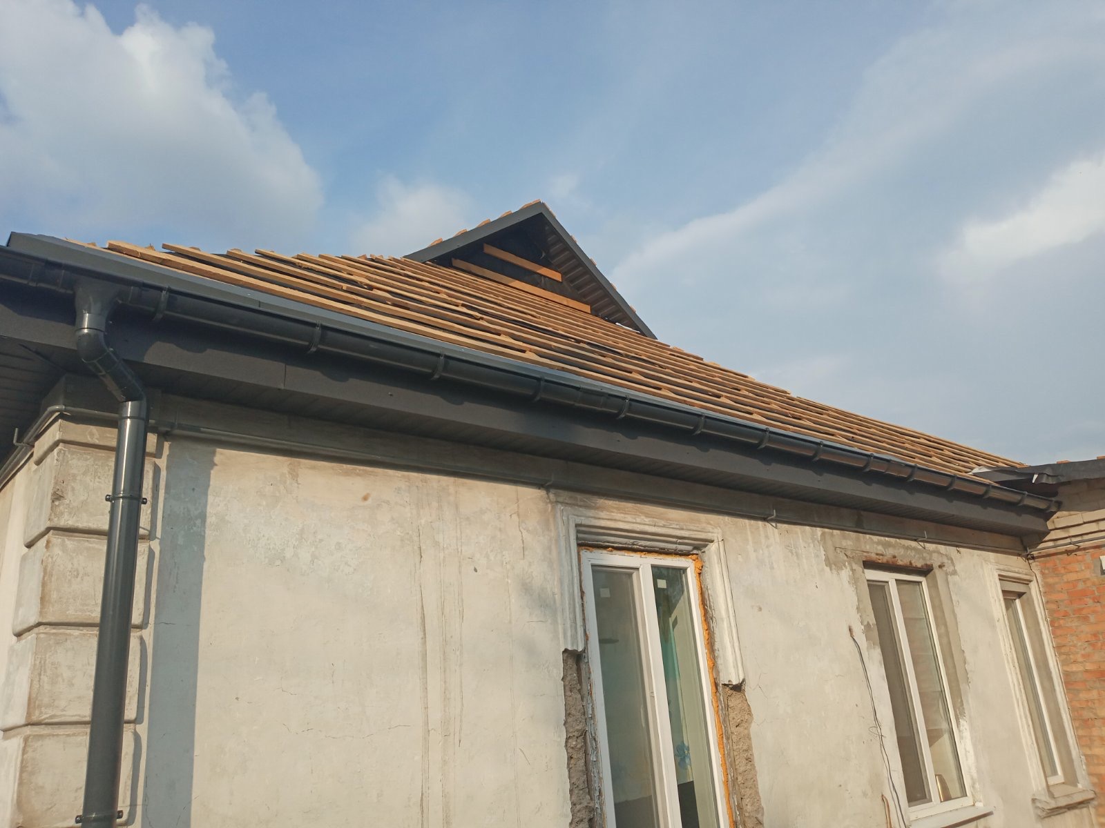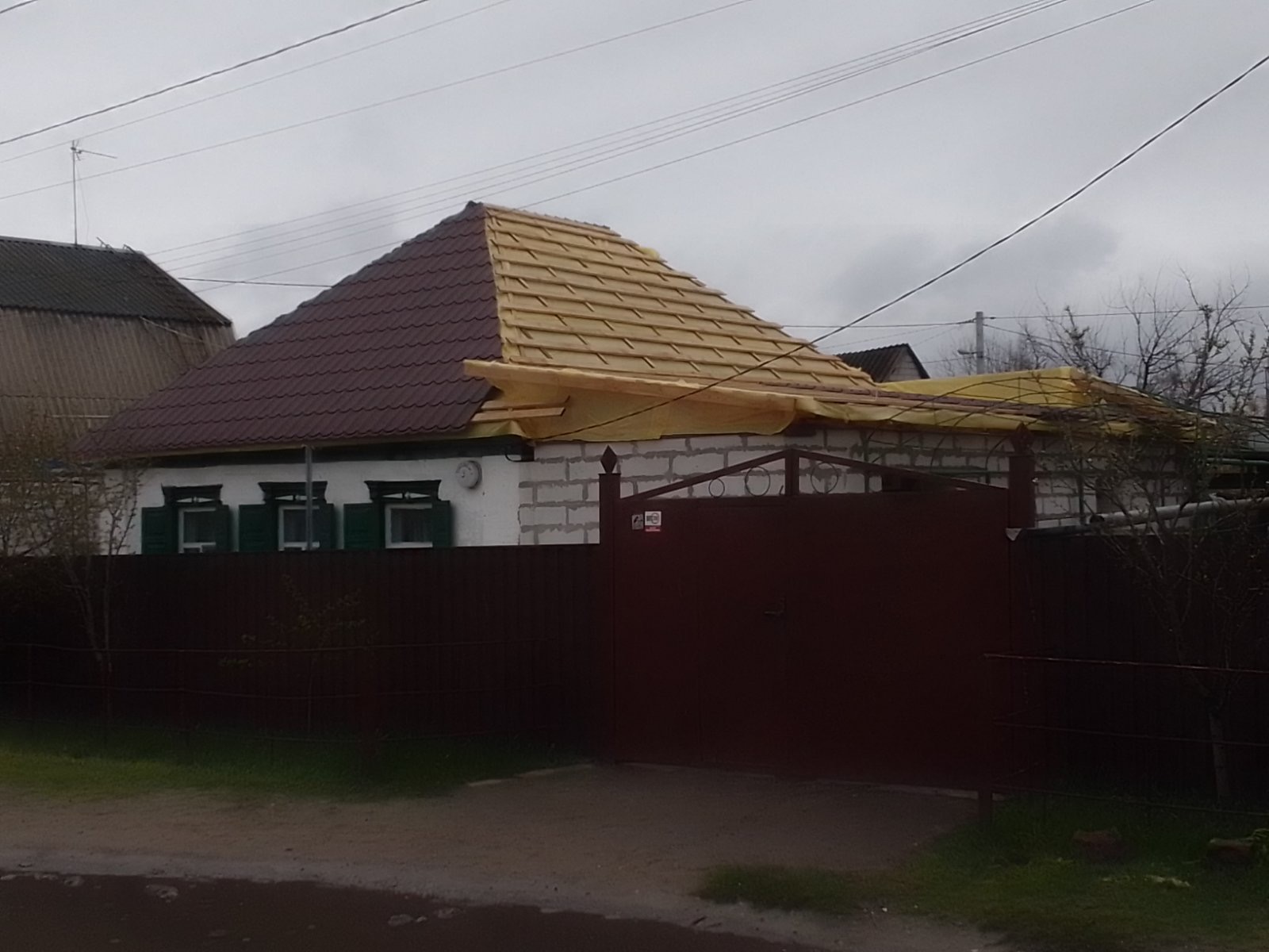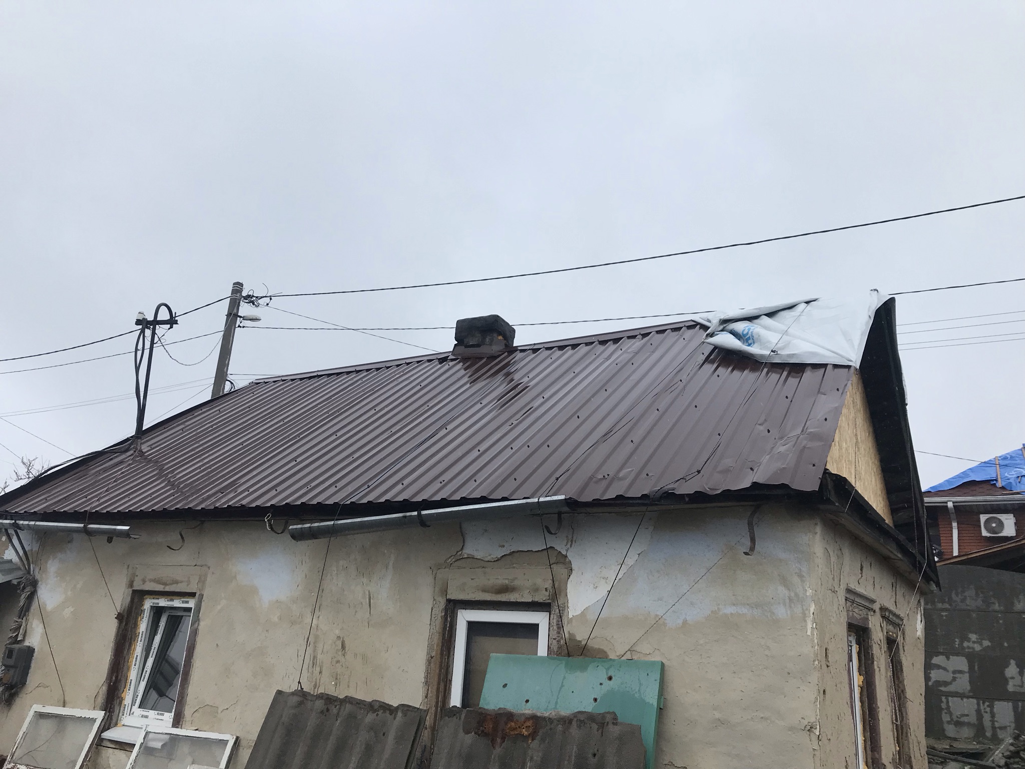 Кровля крыши частного дома. Покрытие кровли металлочерепицей: демонтаж шифера, демонтаж старой обрешётки, ремонт стропильной системы, устройство перекрытия на пристройке к дому, монтаж гидроизоляции, монтаж новой обрешётки, монтаж металлочерепицы, монтаж свесов кровли, монтаж водосточной системы. Общая площадь кровли 154 м 2. (Днепр, АНД район). Март, 2023 год