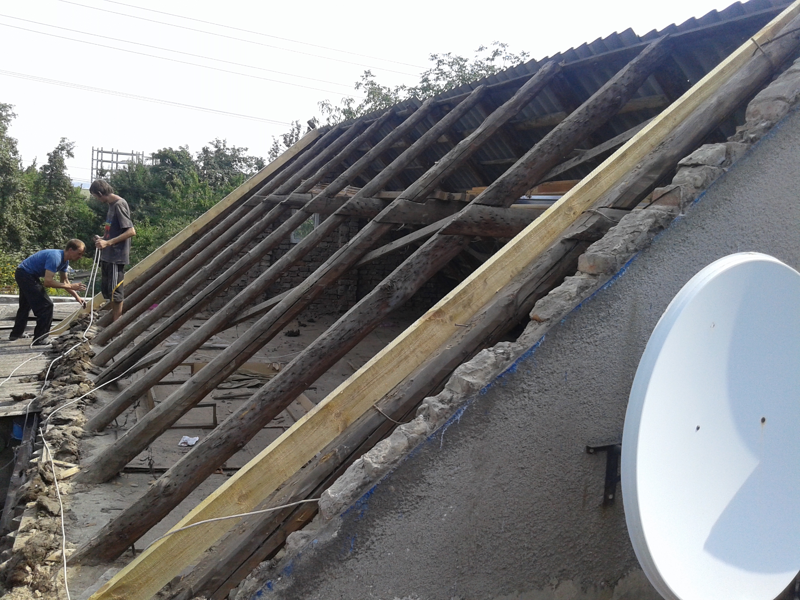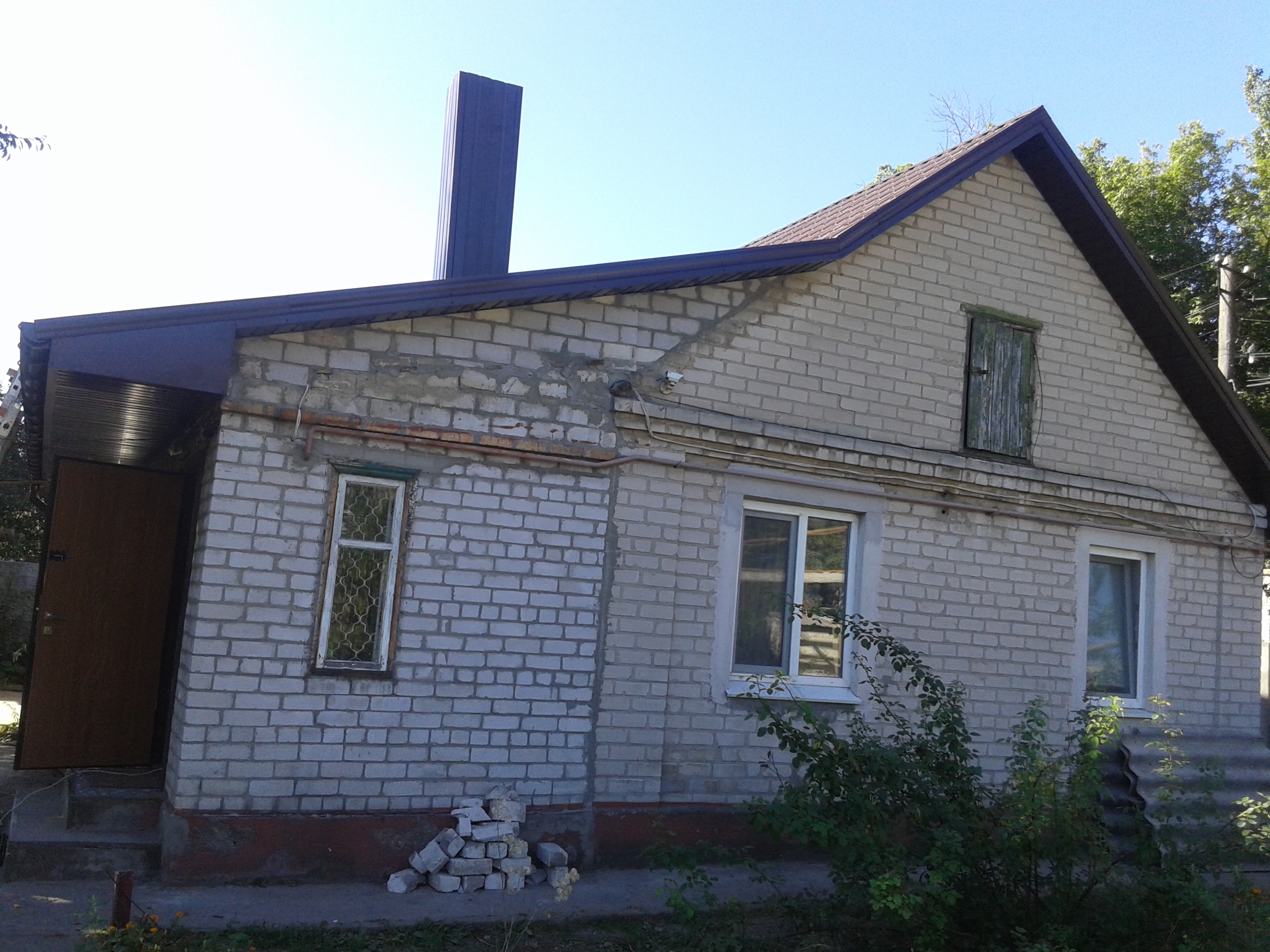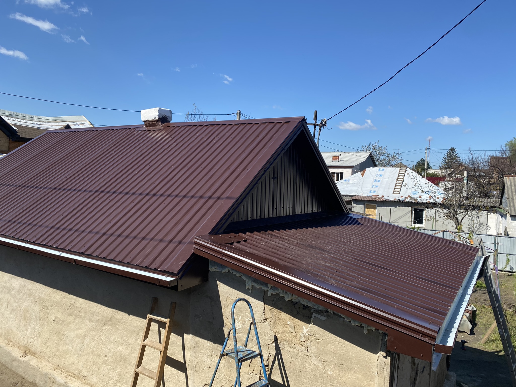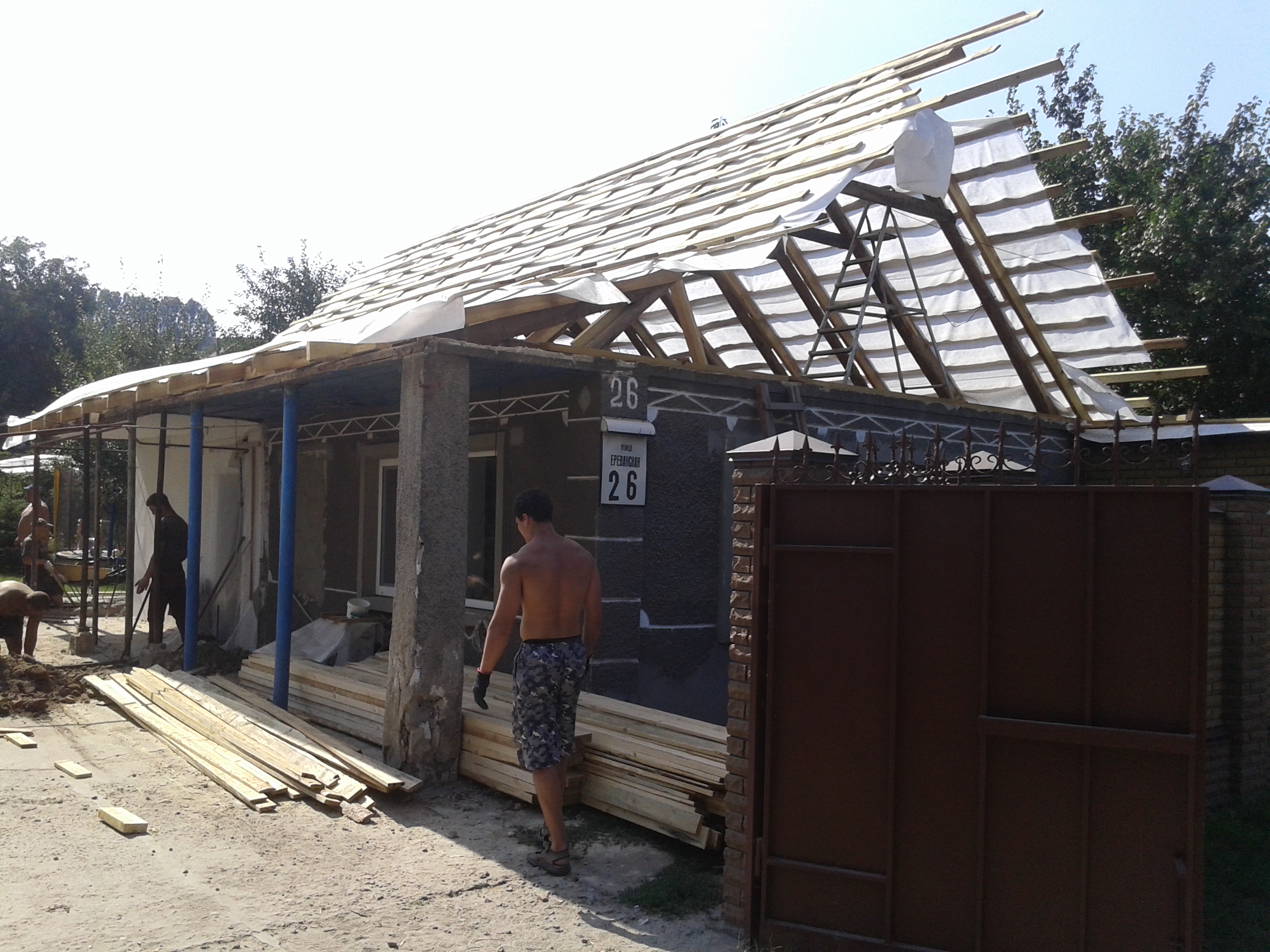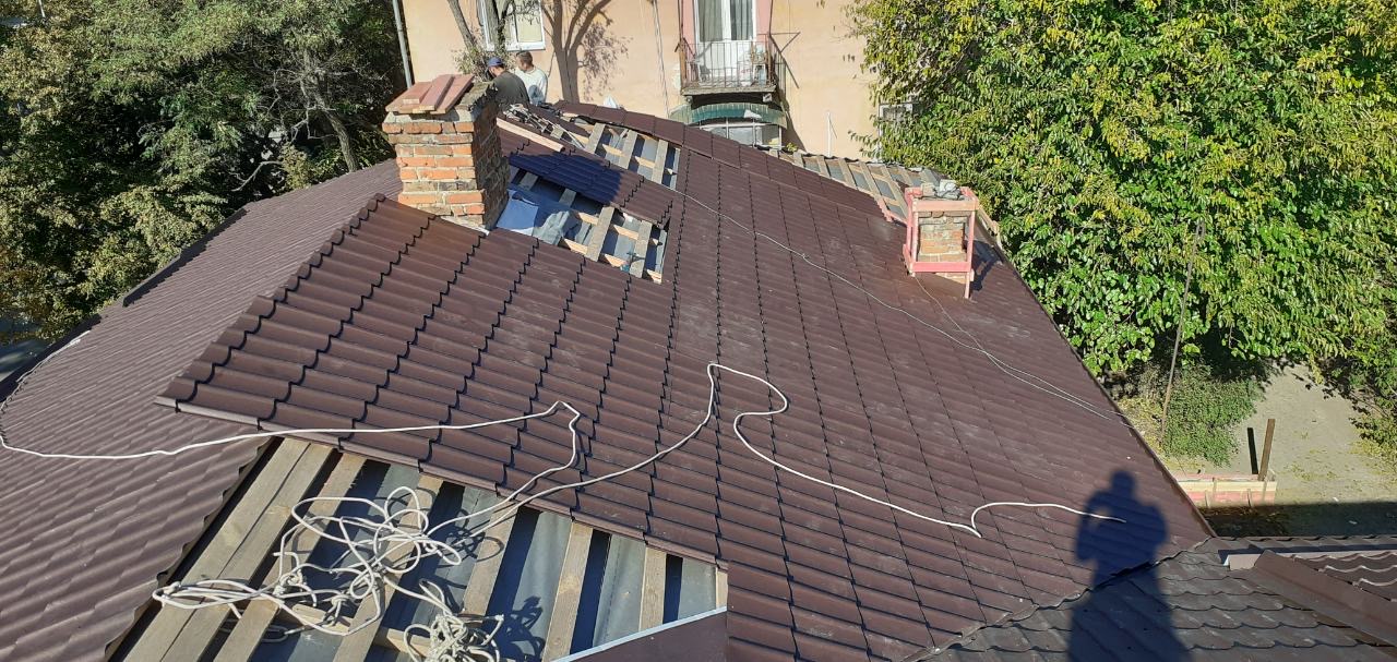 Кровля крыши частного дома: демонтаж шифера, демонтаж старой обрешётки, ремонт стропильной системы, строительство пристройки (кухни) к дому, монтаж гидроизоляции, монтаж новой обрешётки, монтаж металлочерепицы, монтаж свесов кровли, монтаж водосточной системы. Общая площадь кровли 210 м 2 (дом и летняя кухня) (срок выполнения работ 25 – 30рабочих дней). Днепр, ж / м “Победа”.
