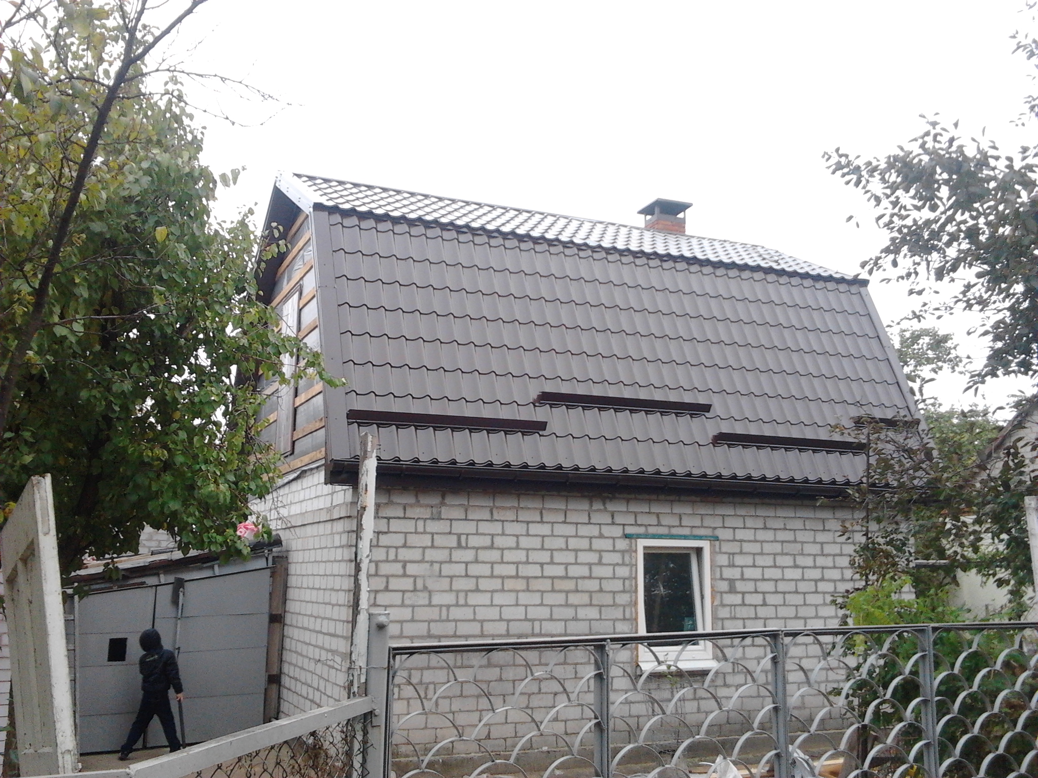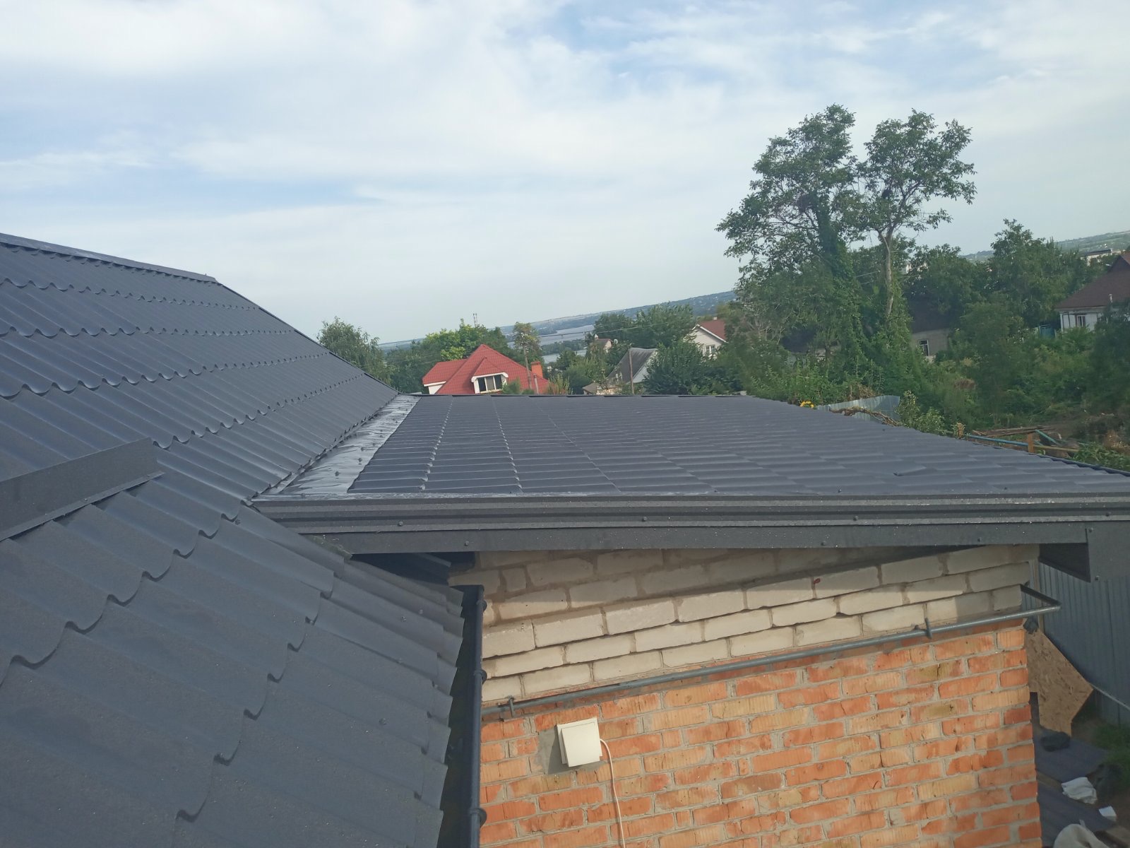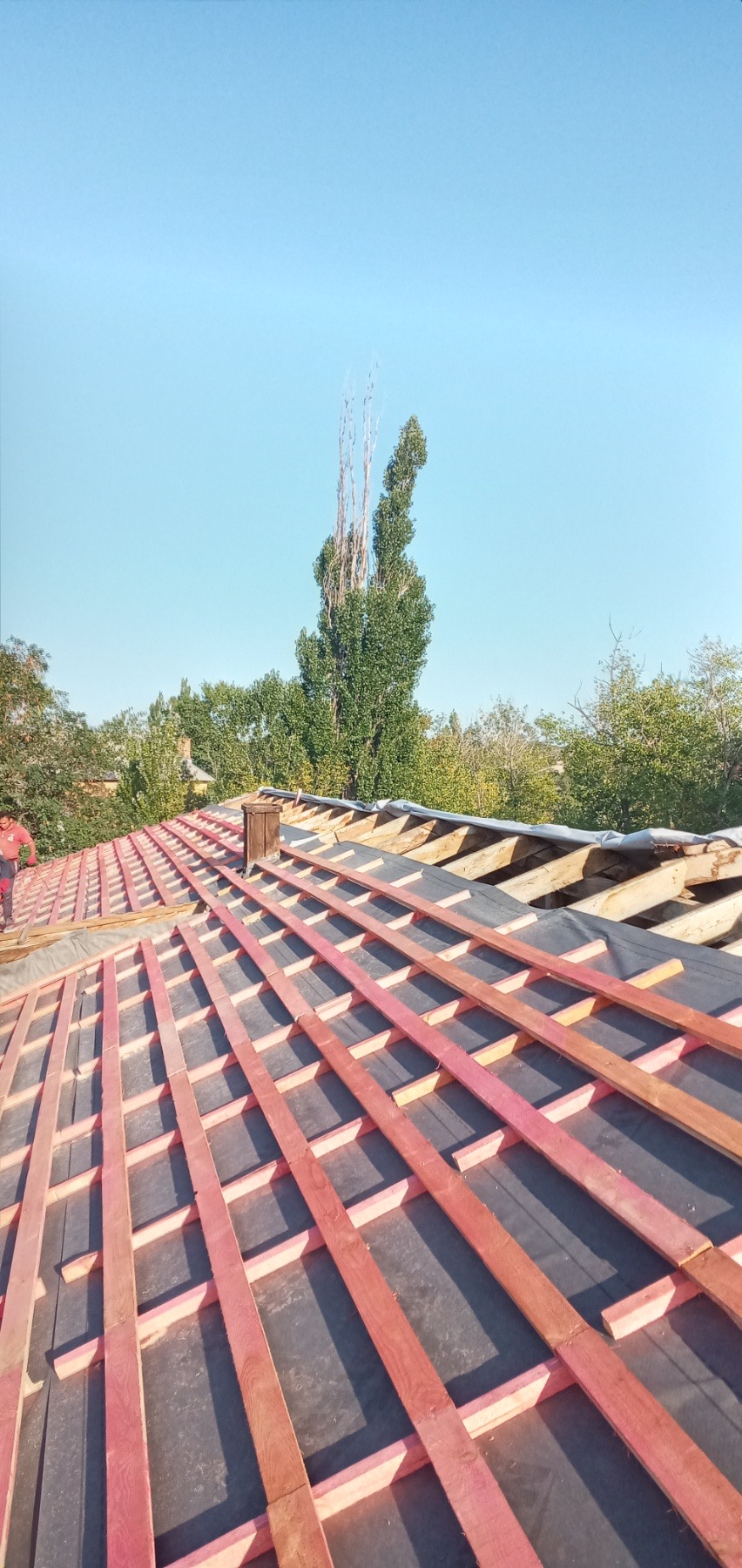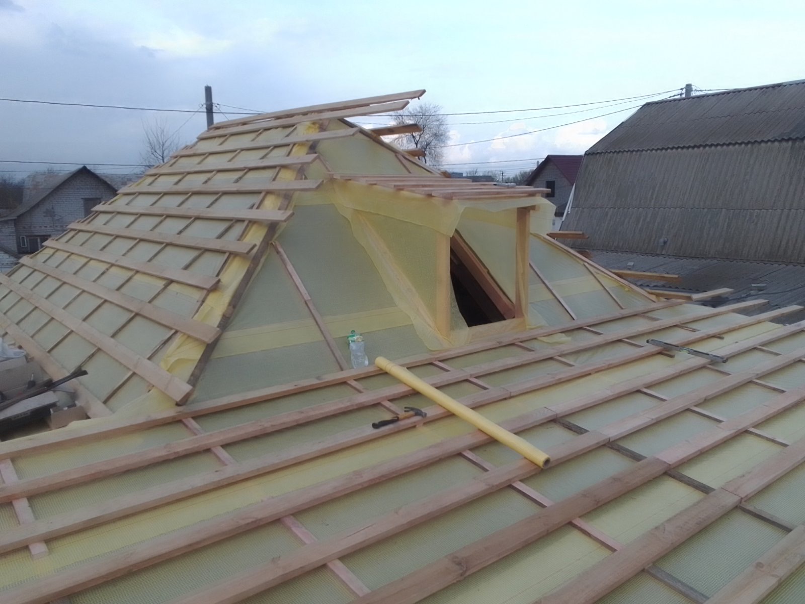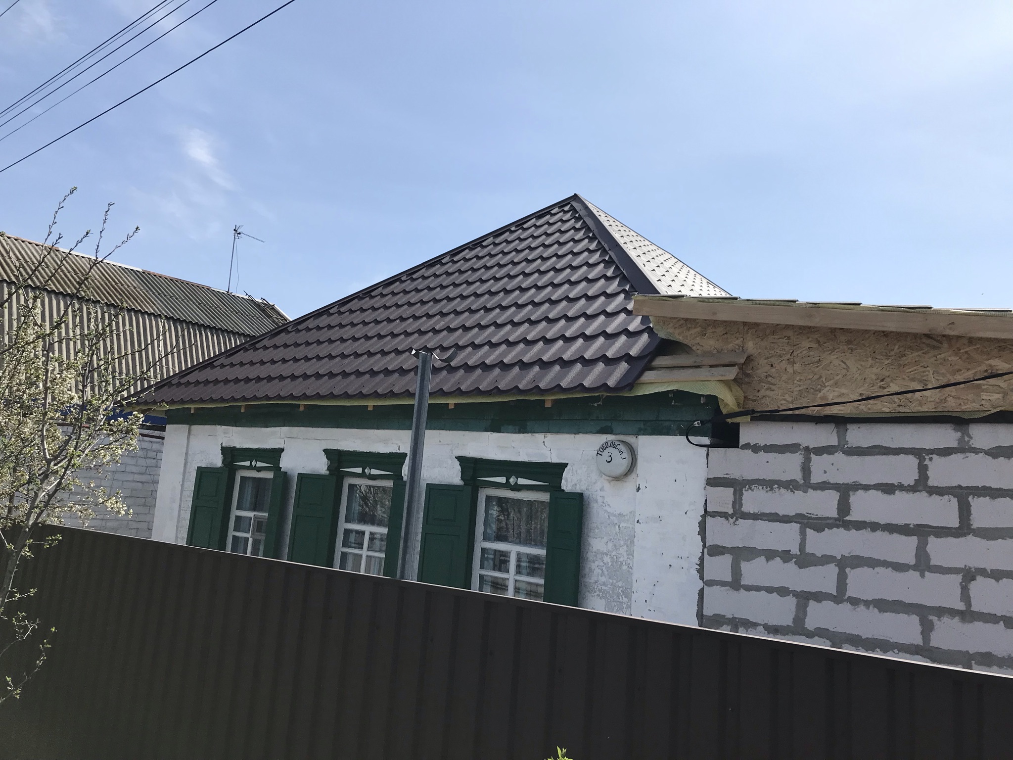 Кровля крыши частного дома: демонтаж шифера, демонтаж старой обрешётки, ремонт стропильной системы, строительство пристройки (кухни) к дому, монтаж гидроизоляции, монтаж новой обрешётки, монтаж металлочерепицы, монтаж свесов кровли, монтаж водосточной системы. Общая площадь кровли 210 м 2 (дом и летняя кухня) (срок выполнения работ 25 – 30рабочих дней). Днепр, ж / м “Победа”.