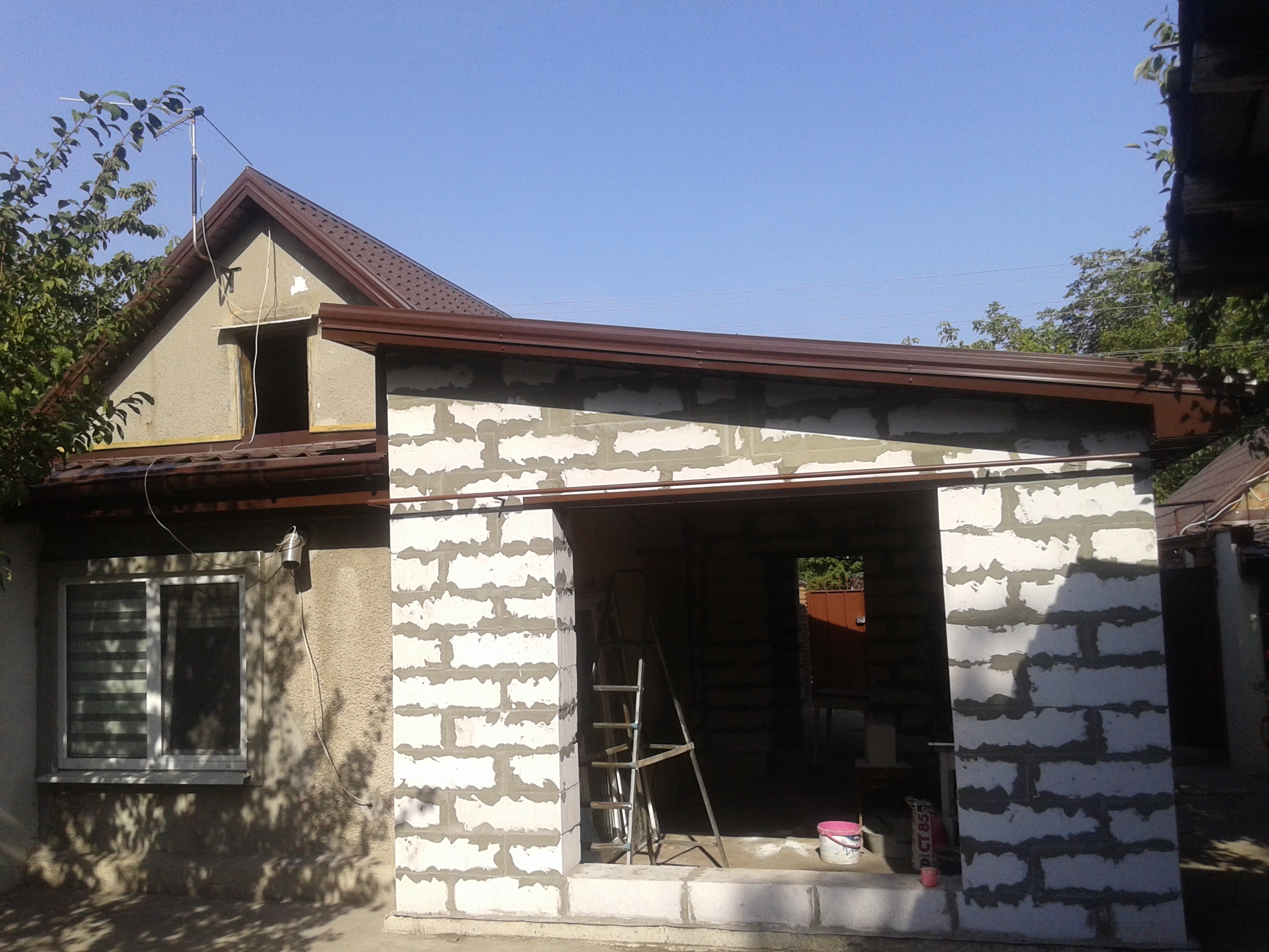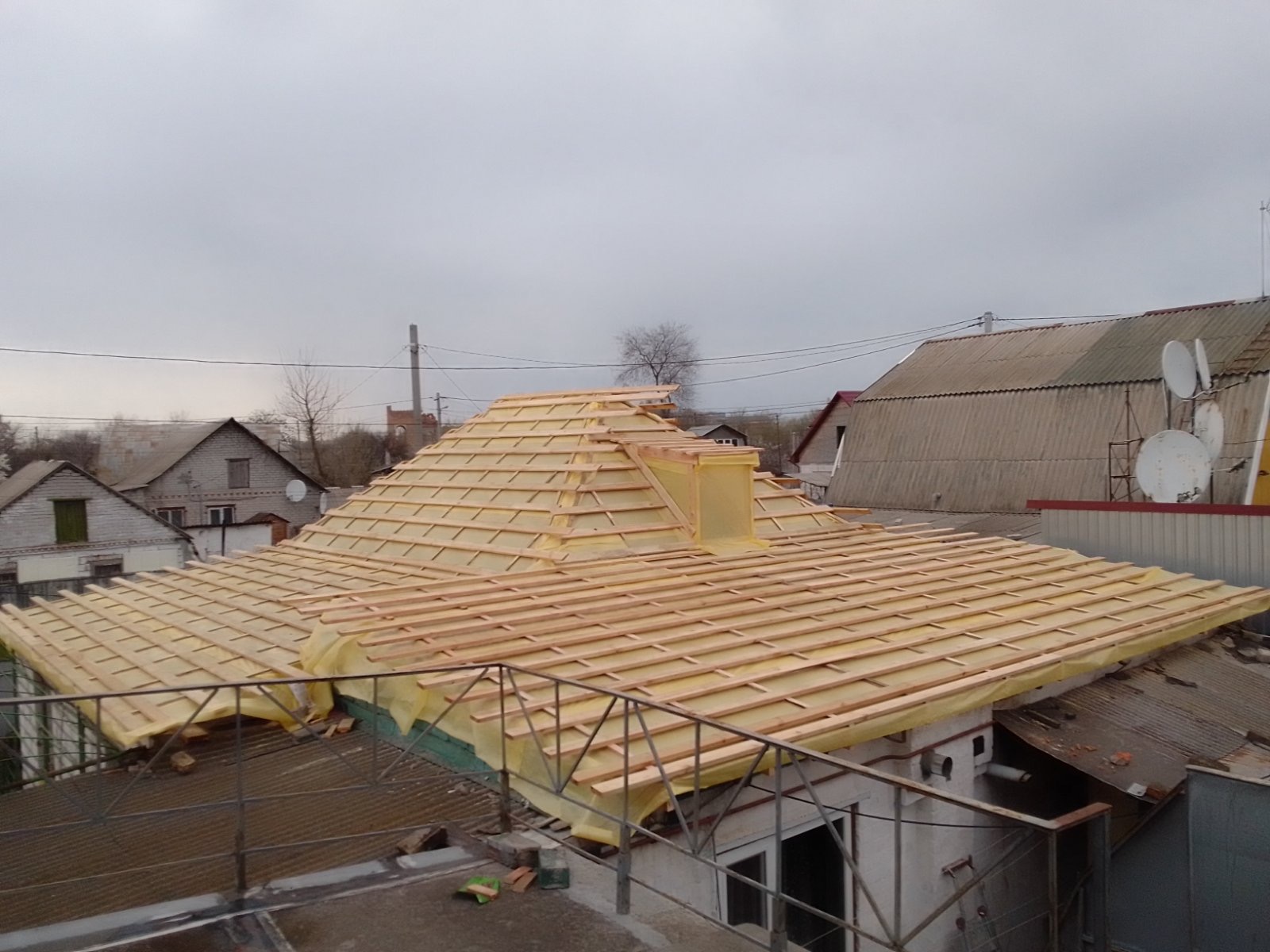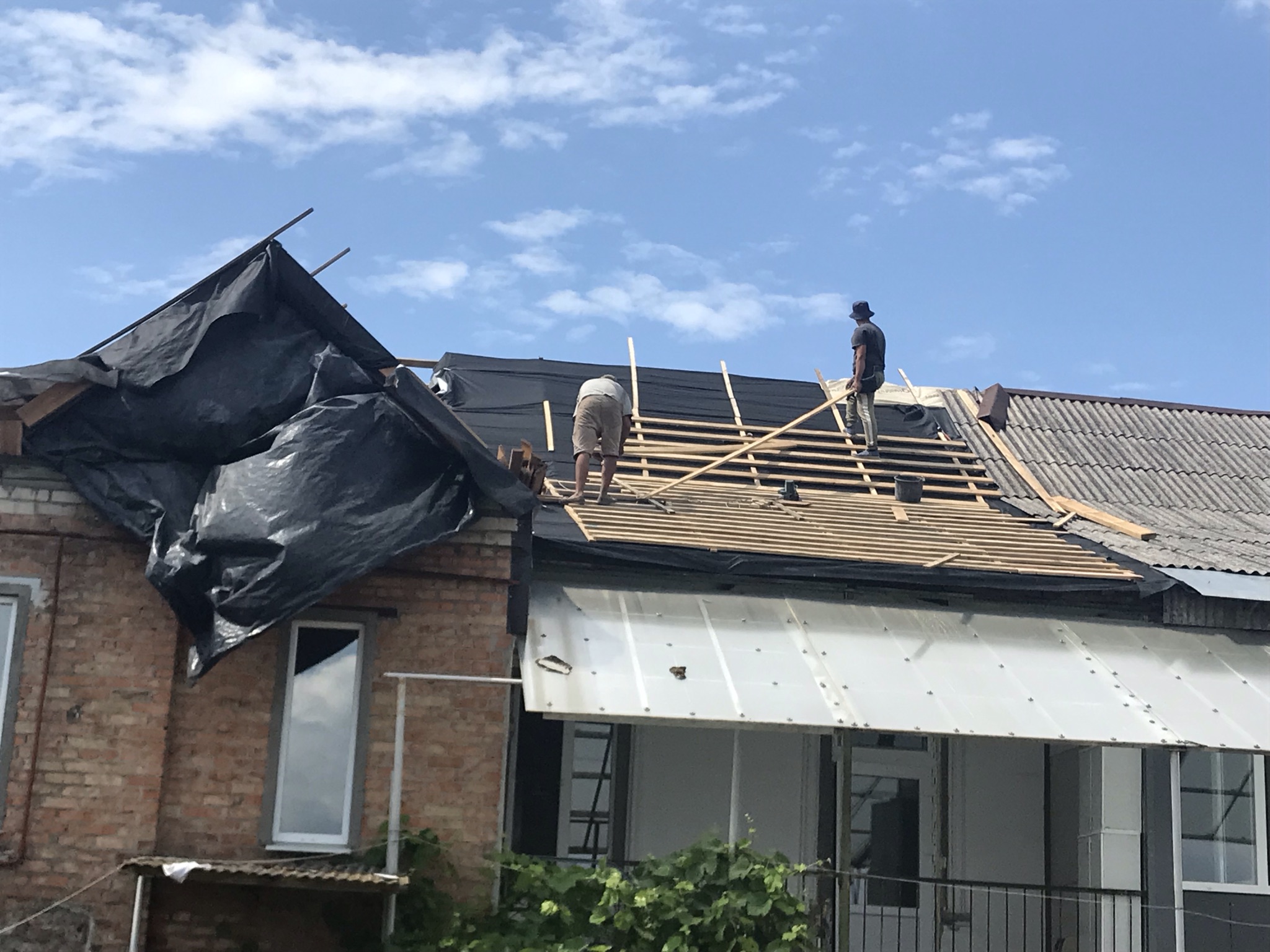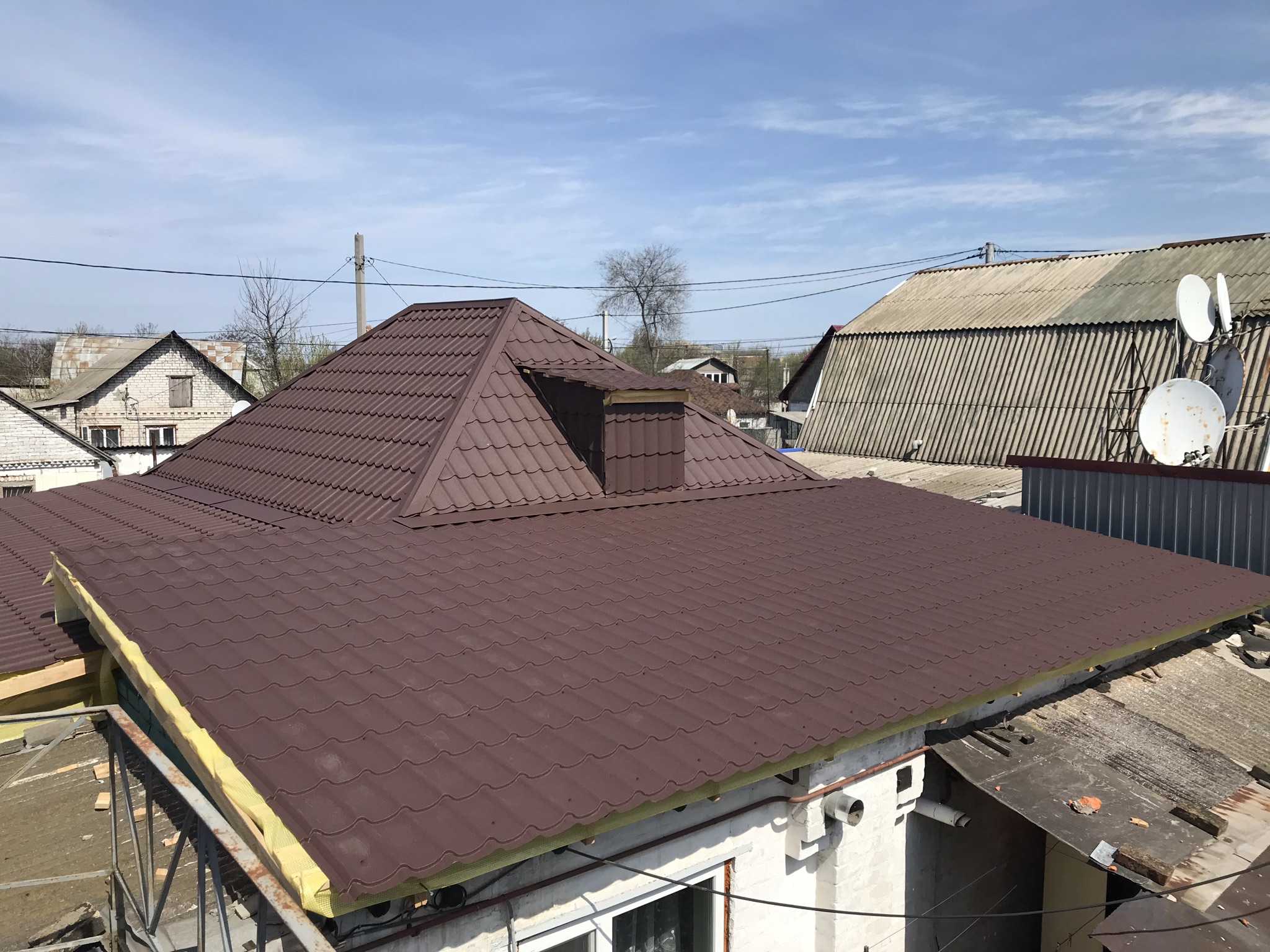 Кровля крыши частного дома: демонтаж шифера, демонтаж старой обрешётки, ремонт стропильной системы, строительство пристройки (кухни) к дому, монтаж гидроизоляции, монтаж новой обрешётки, монтаж металлочерепицы, монтаж свесов кровли, монтаж водосточной системы. Общая площадь кровли 210 м 2 (дом и летняя кухня) (срок выполнения работ 25 – 30рабочих дней). Днепр, ж / м “Победа”.