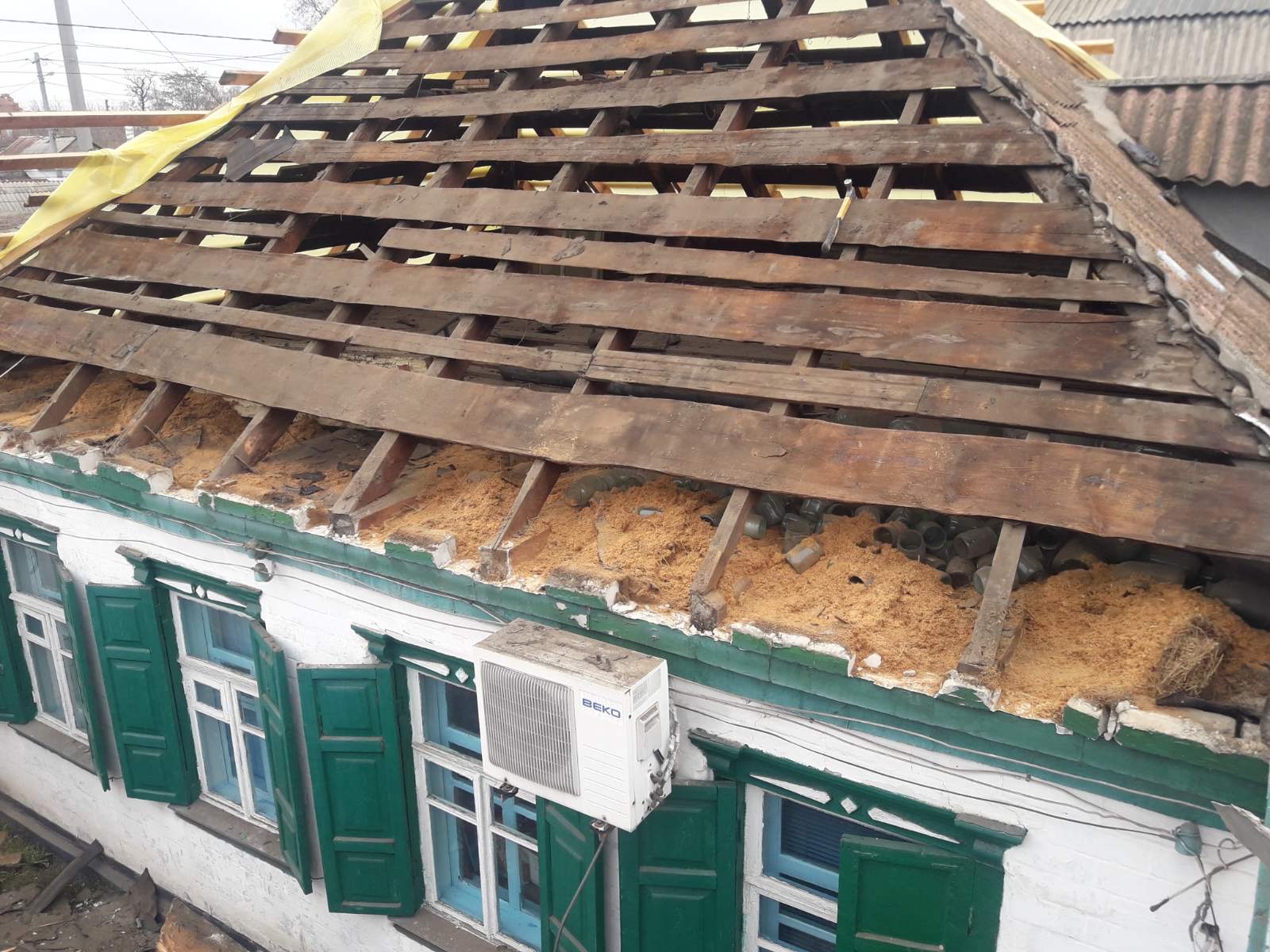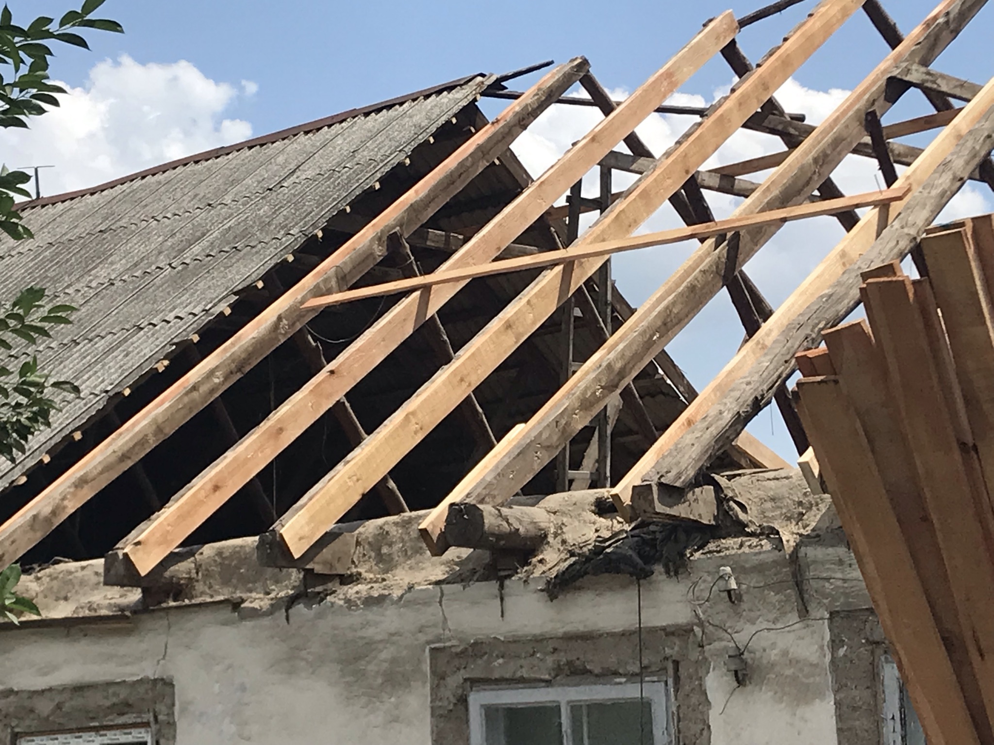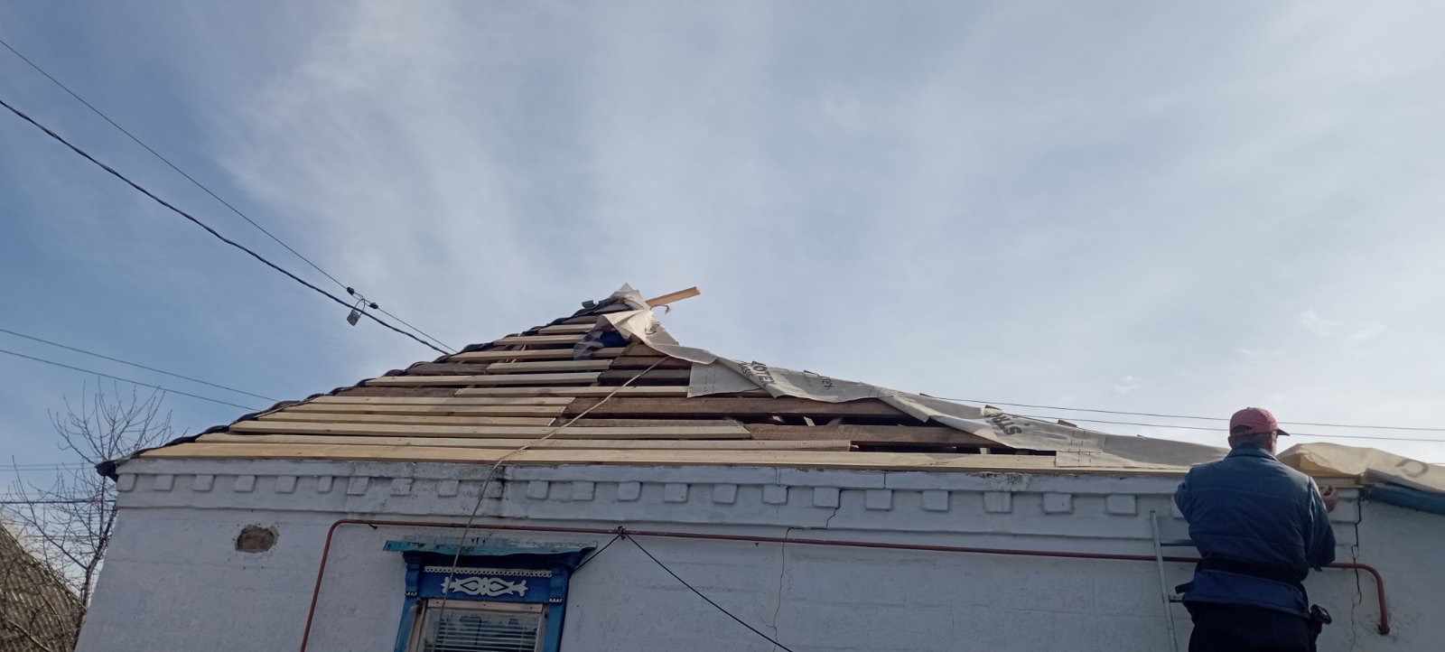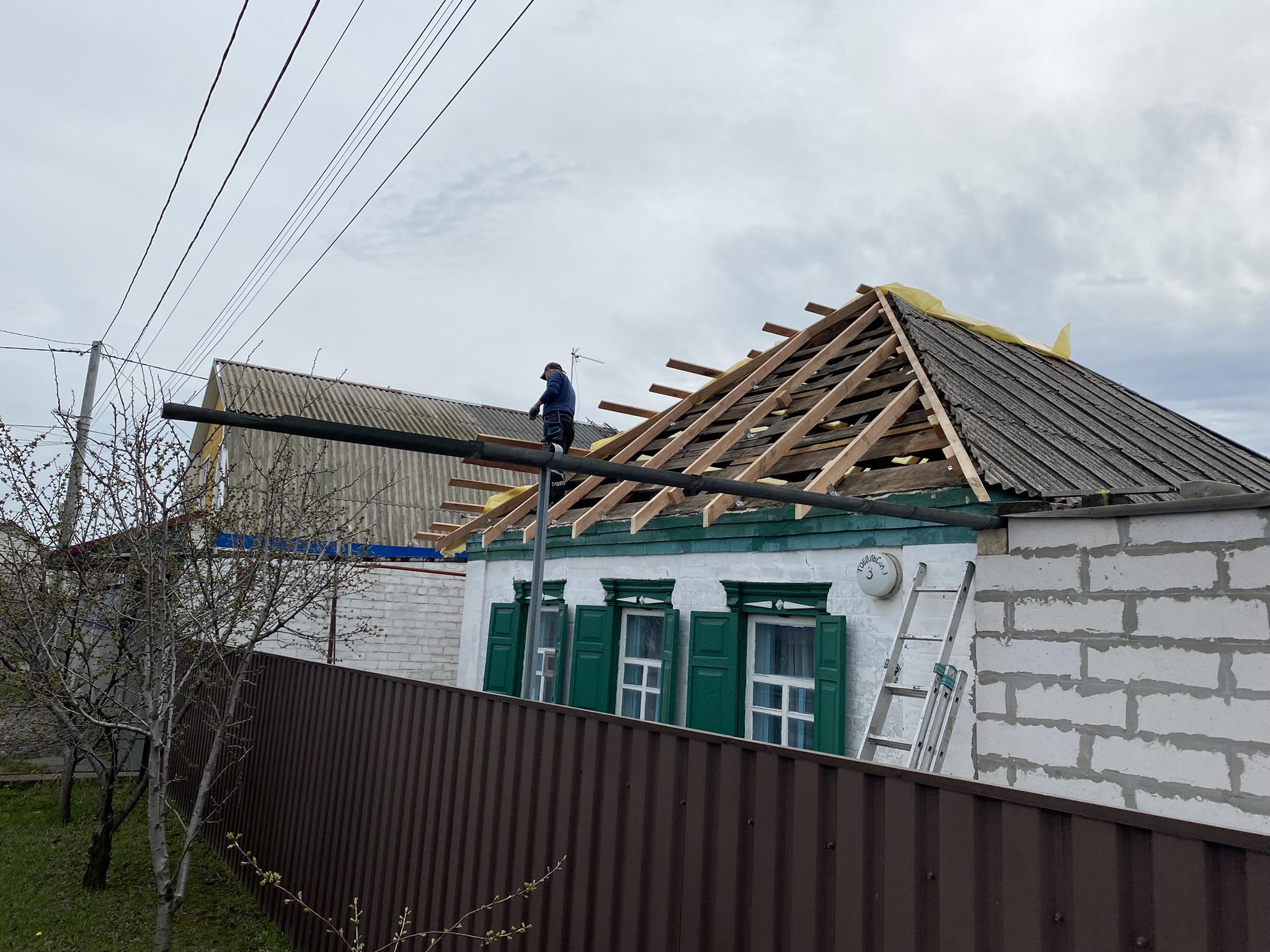 Кровля крыши частного дома. Повреждение дома после “рашисткого” прилёта !!! Новая кровля: демонтаж старой кровли, монтаж новой стропильной системы, монтаж каркаса фронтонов на кровле, монтаж гидроизоляции, монтаж обрешётки, монтаж профнастила, монтаж свесов кровли, монтаж водосточной системы. Общая площадь кровли 52 м 2 (срок выполнения работ 10 – 12 рабочих дней). Днепр, АНД Район. Апрель 2024 г.
