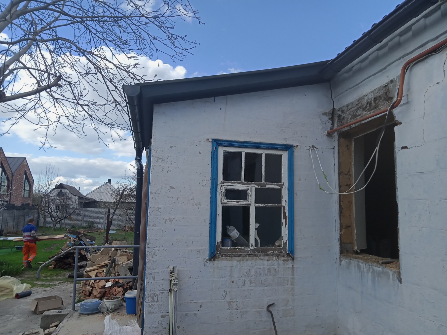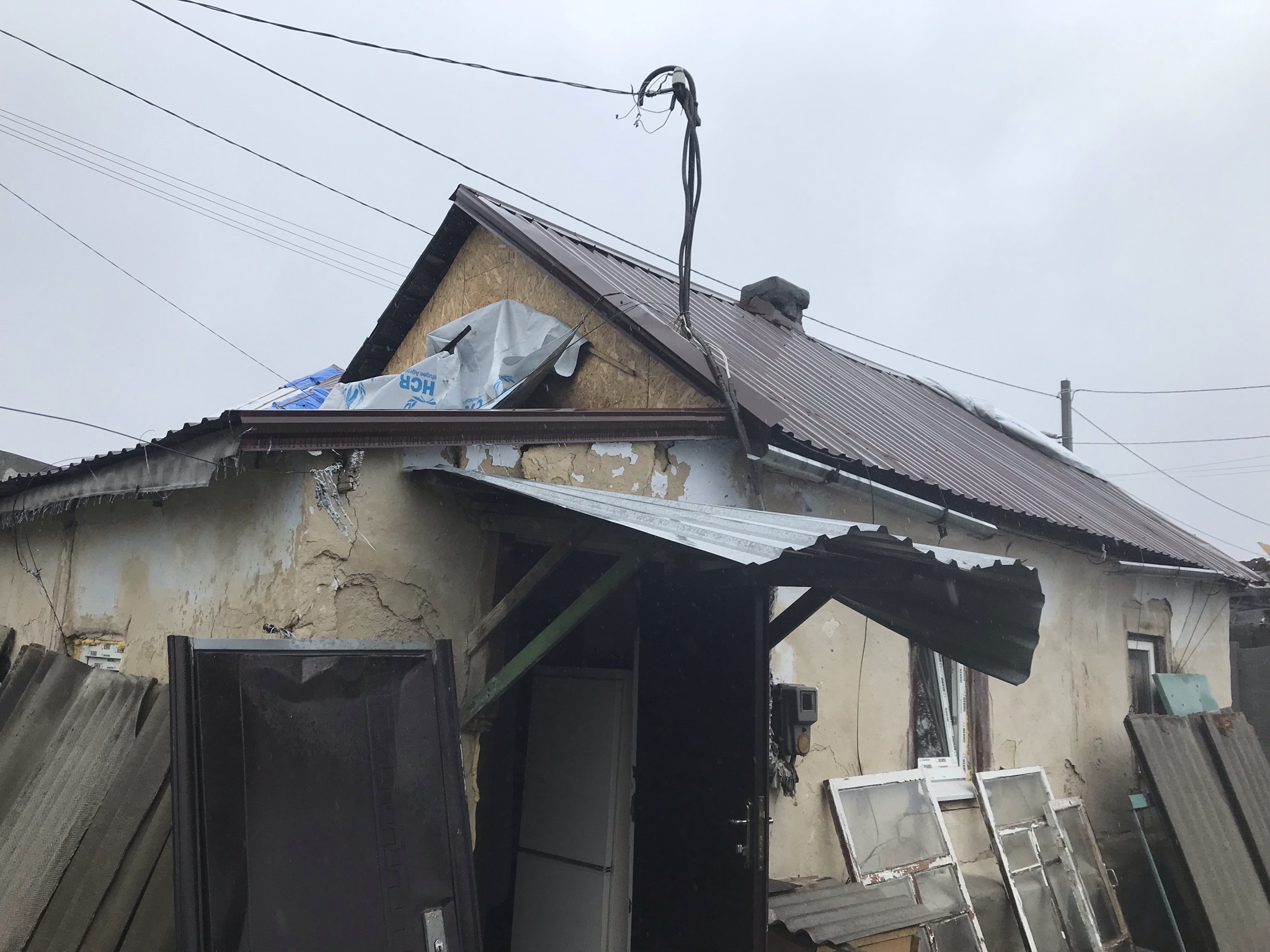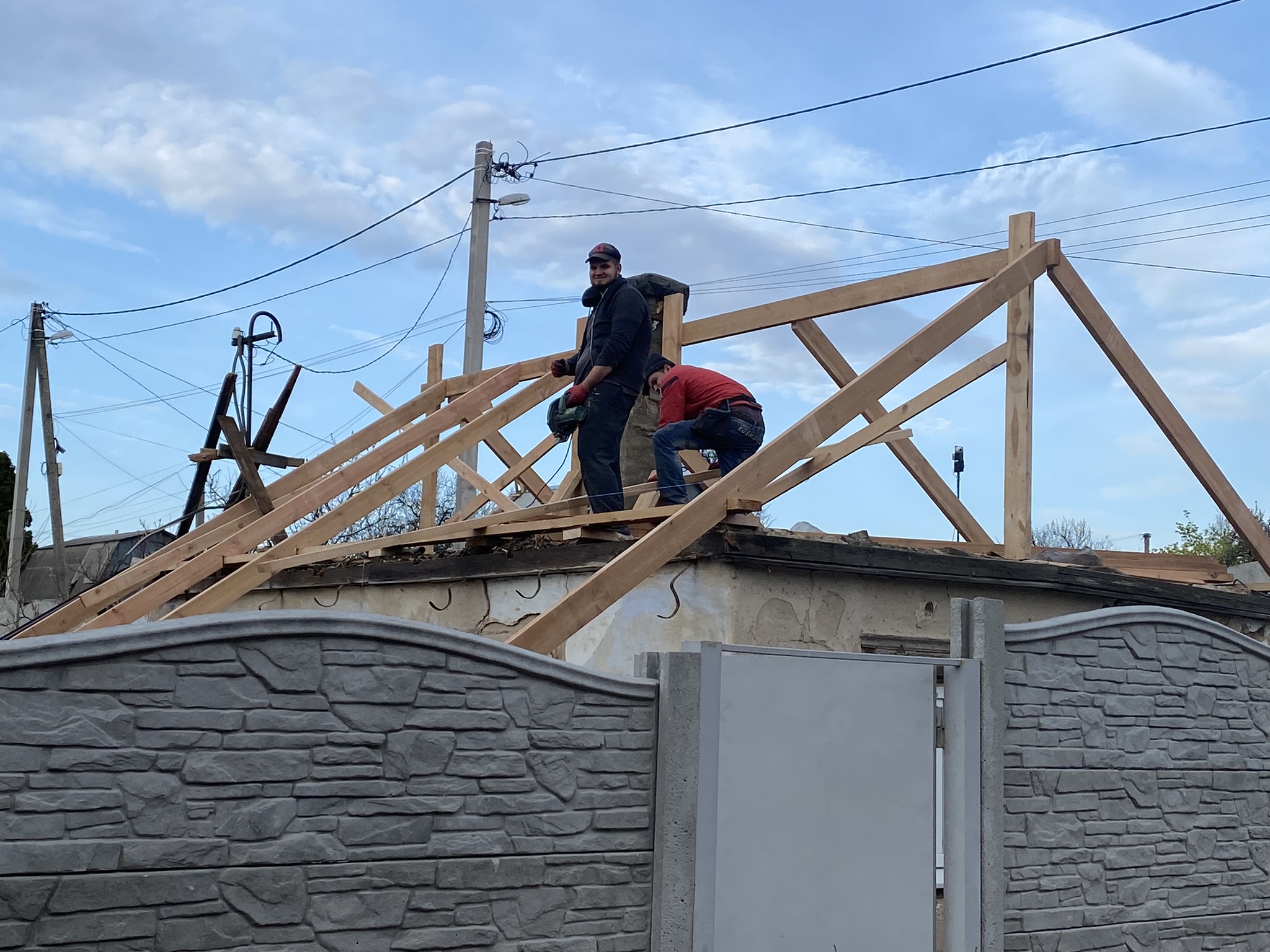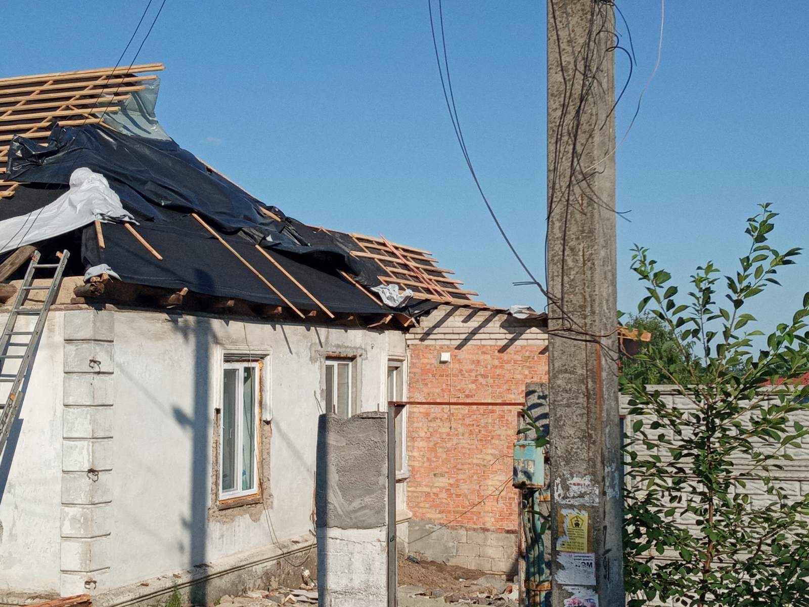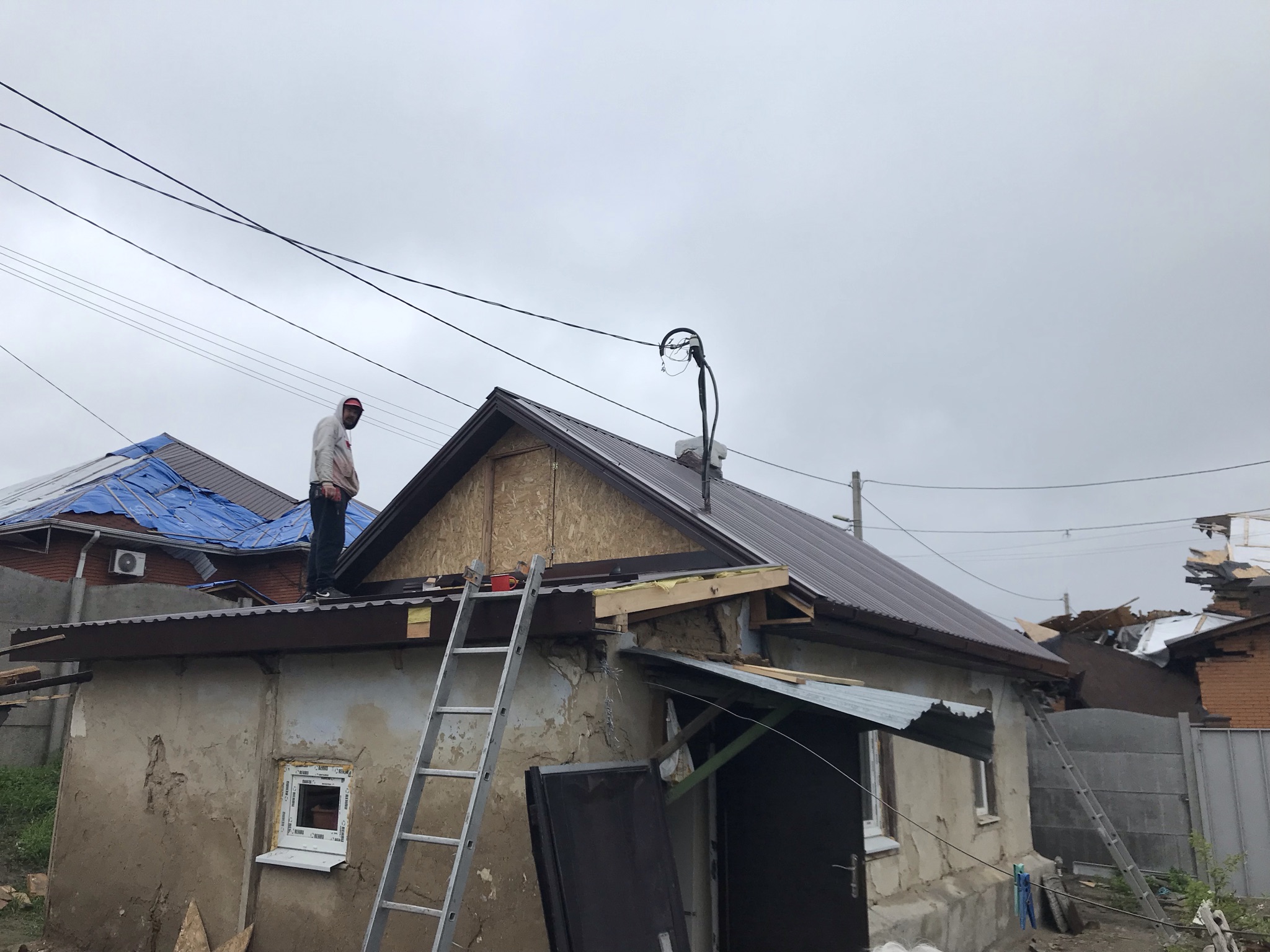 Кровля крыши частного дома. Повреждение дома после “рашисткого” прилёта !!! Новая кровля: демонтаж старой кровли, монтаж новой стропильной системы, монтаж каркаса фронтонов на кровле, монтаж гидроизоляции, монтаж обрешётки, монтаж профнастила, монтаж свесов кровли, монтаж водосточной системы. Общая площадь кровли 52 м 2 (срок выполнения работ 10 – 12 рабочих дней). Днепр, АНД Район. Апрель 2024 г.