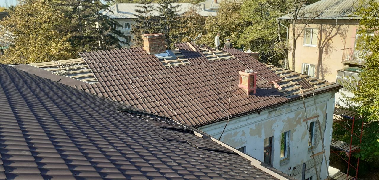 Кровля крыши многоквартирного дома: демонтаж шифера, демонтаж старой обрешётки, монтаж гидроизоляции, монтаж новой обрешётки, монтаж металлочерепицы, монтаж водосточной системы. Общая площадь кровли 770 м 2 (срок выполнения работ 20 – 25 рабочих дней). Днепр, ж / м “Приднепровск”.