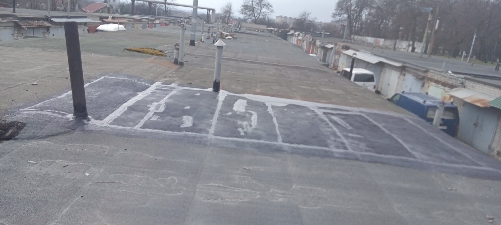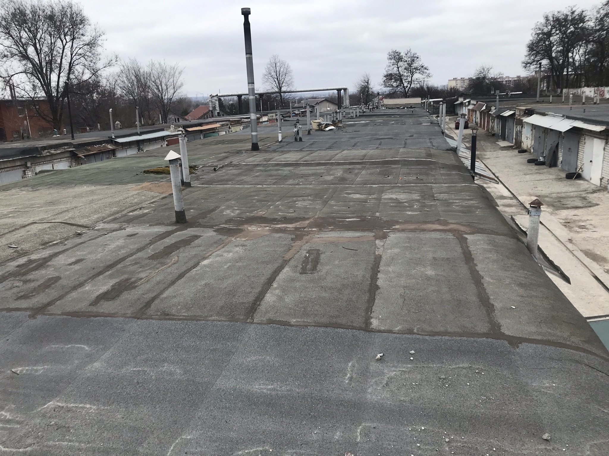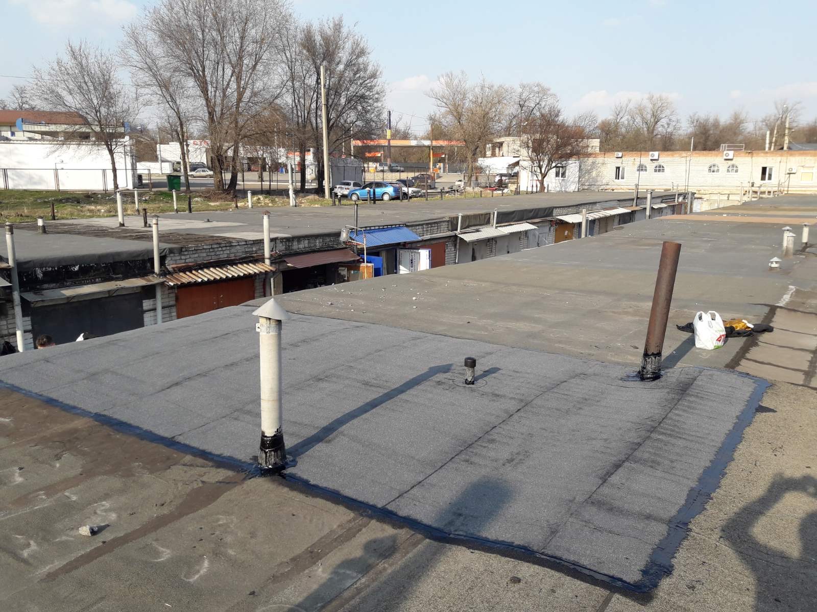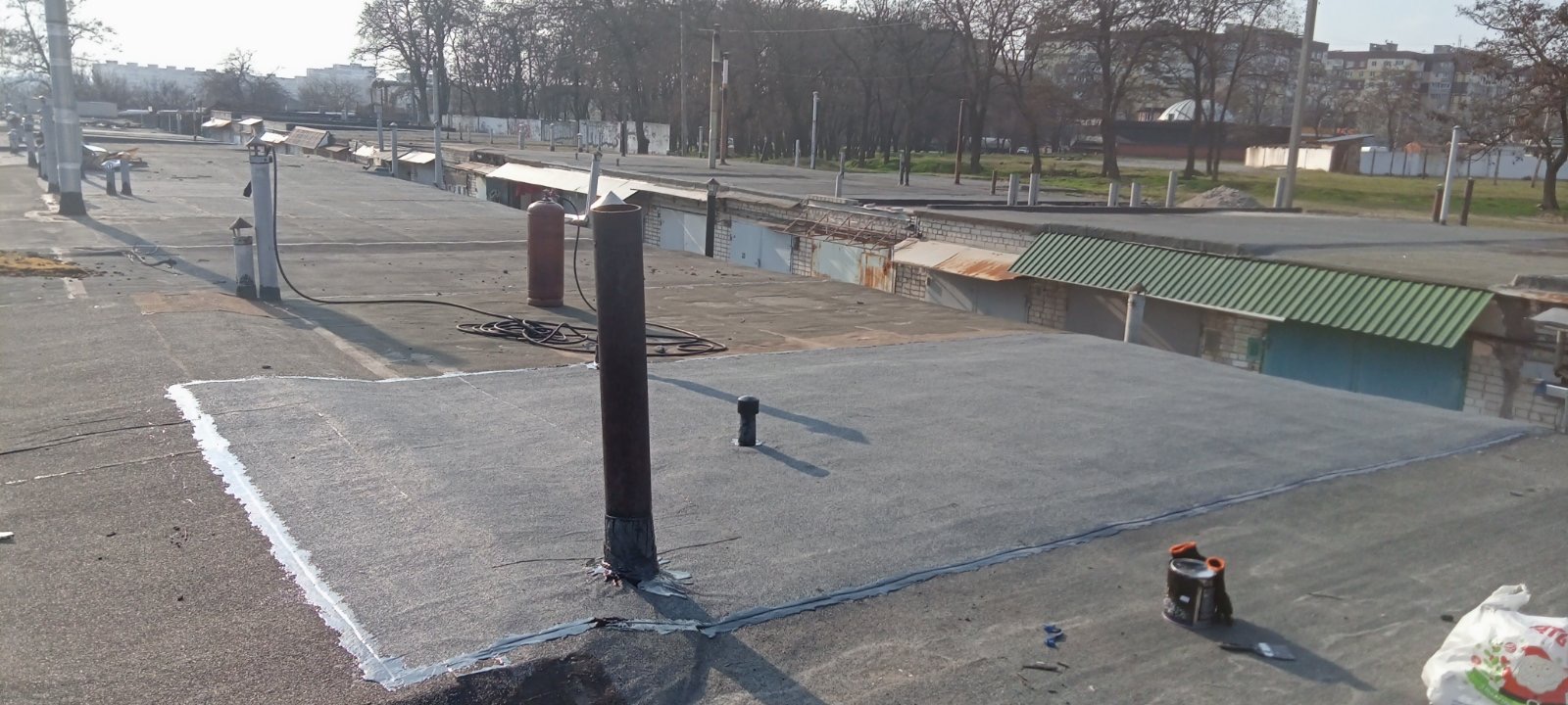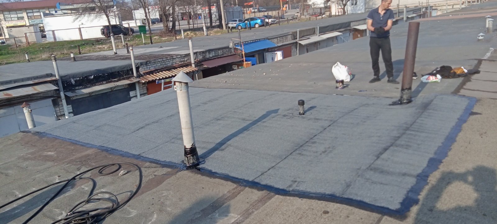 Кровля крыши на гараже: очистка поверхности, праймеровка поверхности, монтаж козырька, укладка наплавляемого руберойда. Площадь кровли 30 м 2 (Днепр, АНД район). Апрель 2023 г.