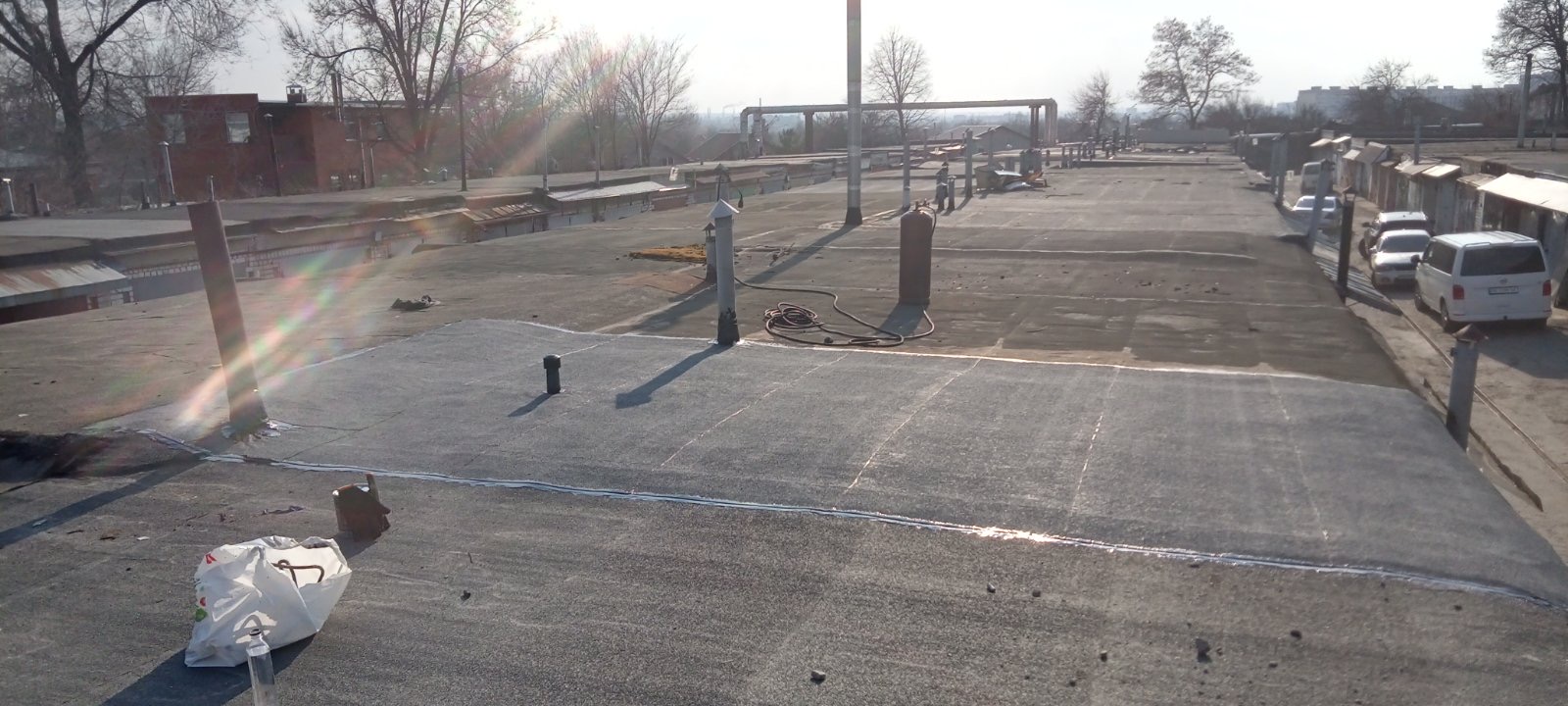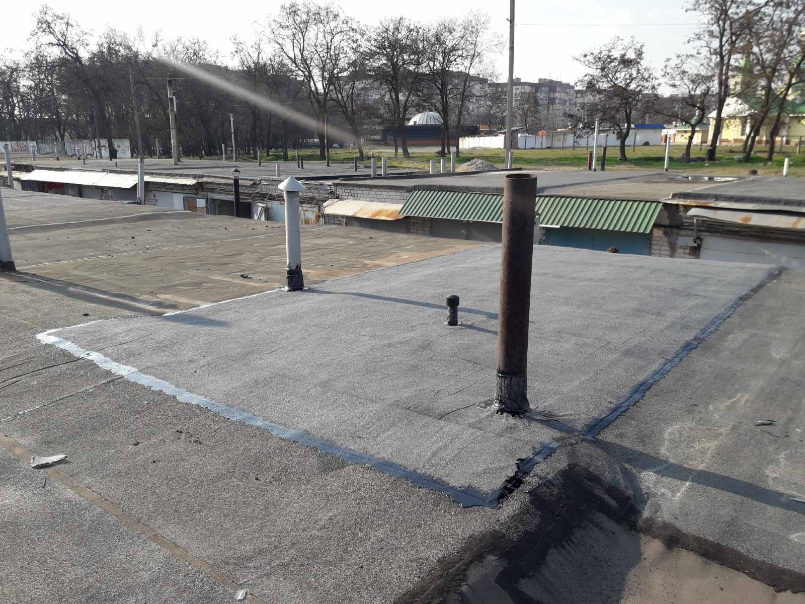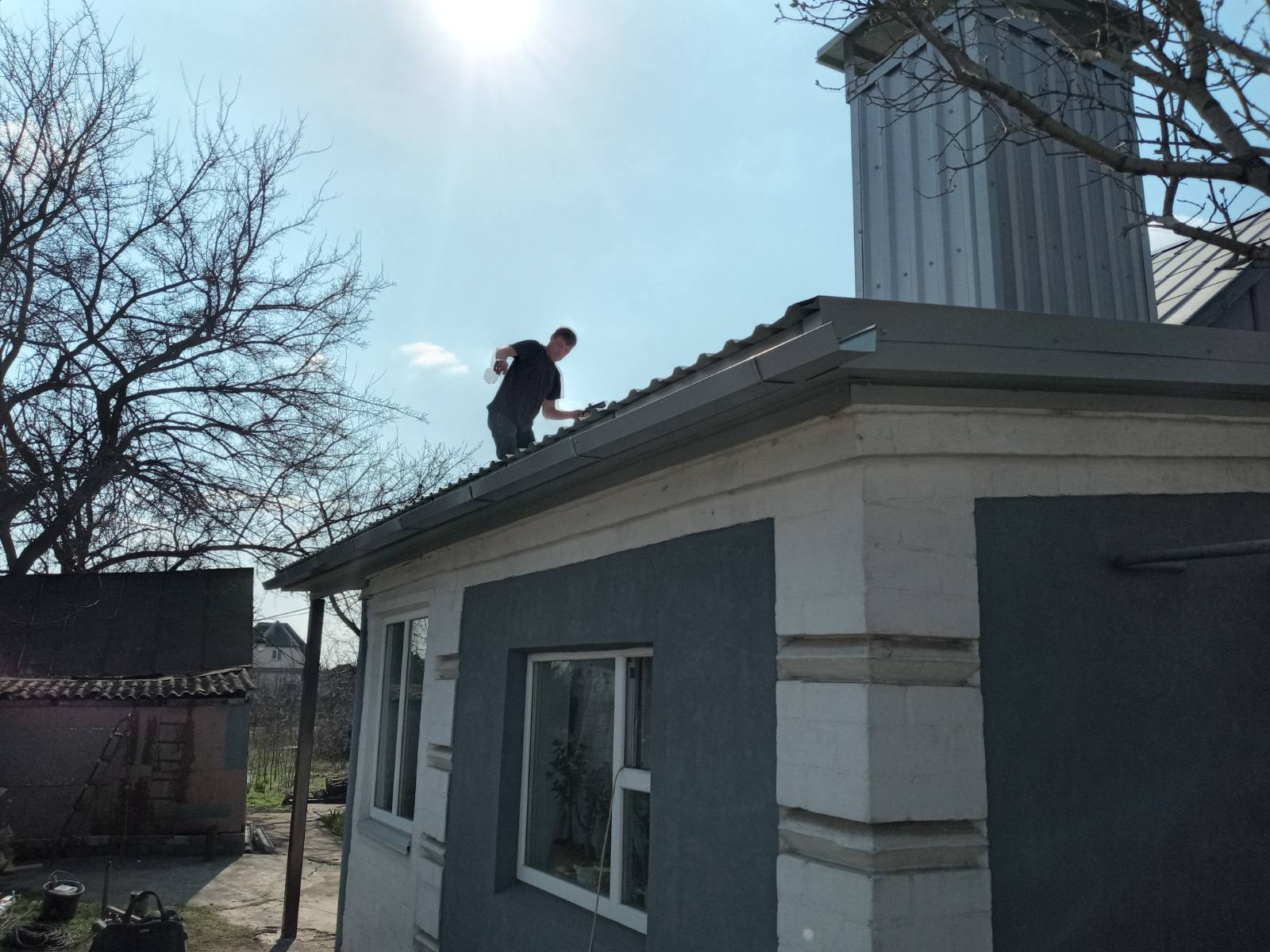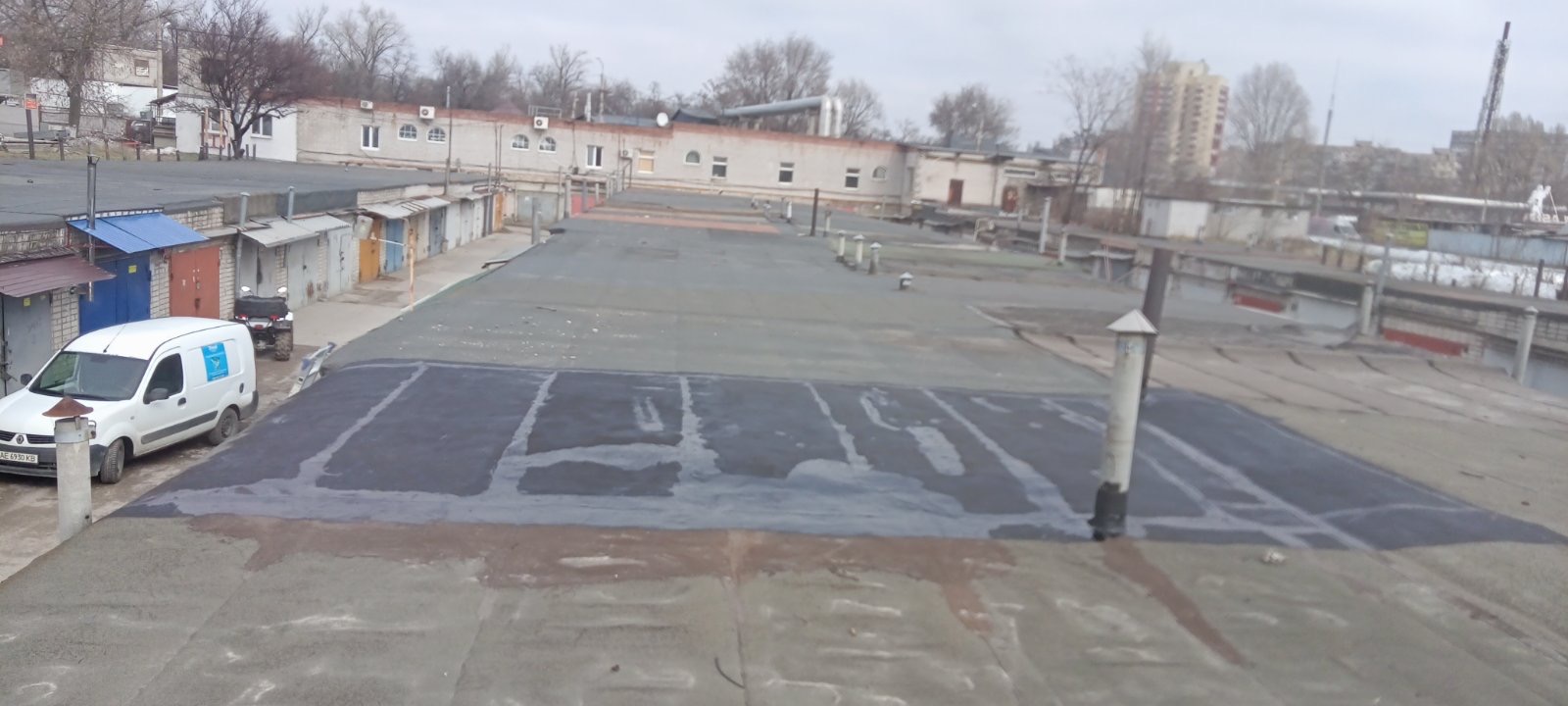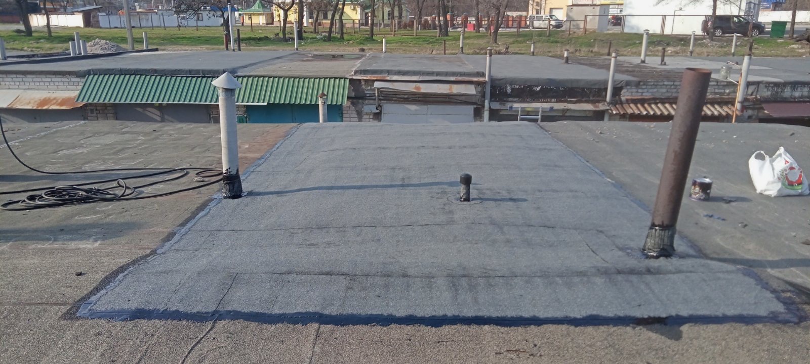 Кровля крыши на гараже: очистка поверхности, праймеровка поверхности, монтаж козырька, укладка наплавляемого руберойда. Площадь кровли 30 м 2 (Днепр, АНД район). Апрель 2023 г.