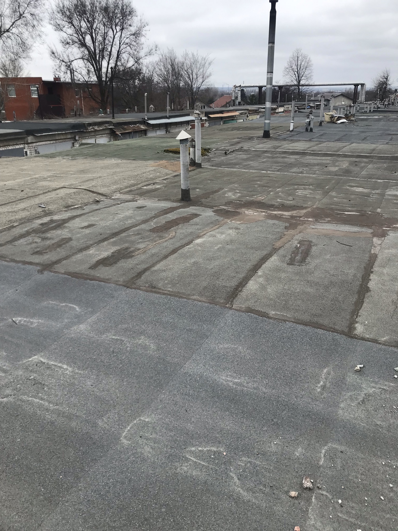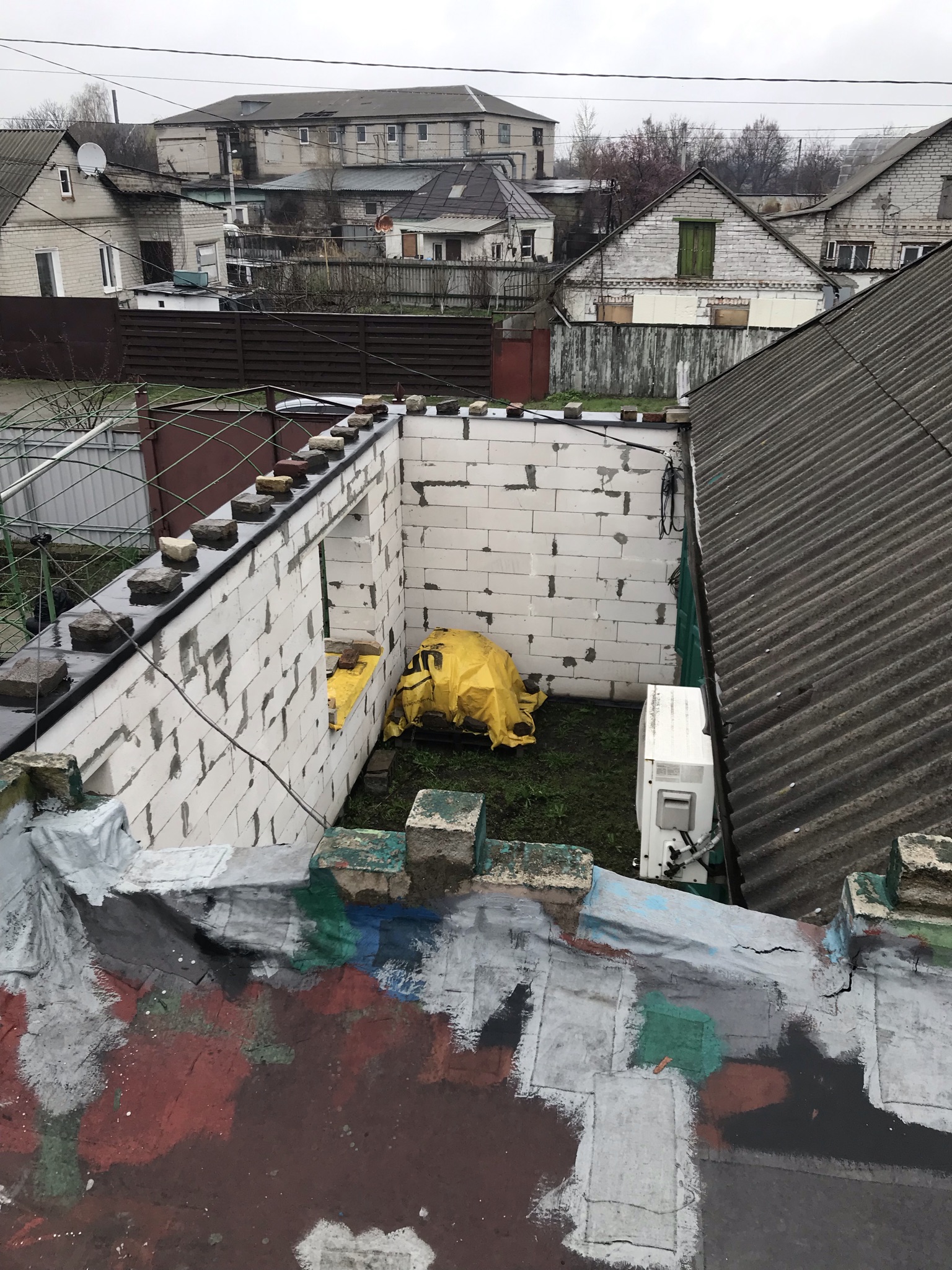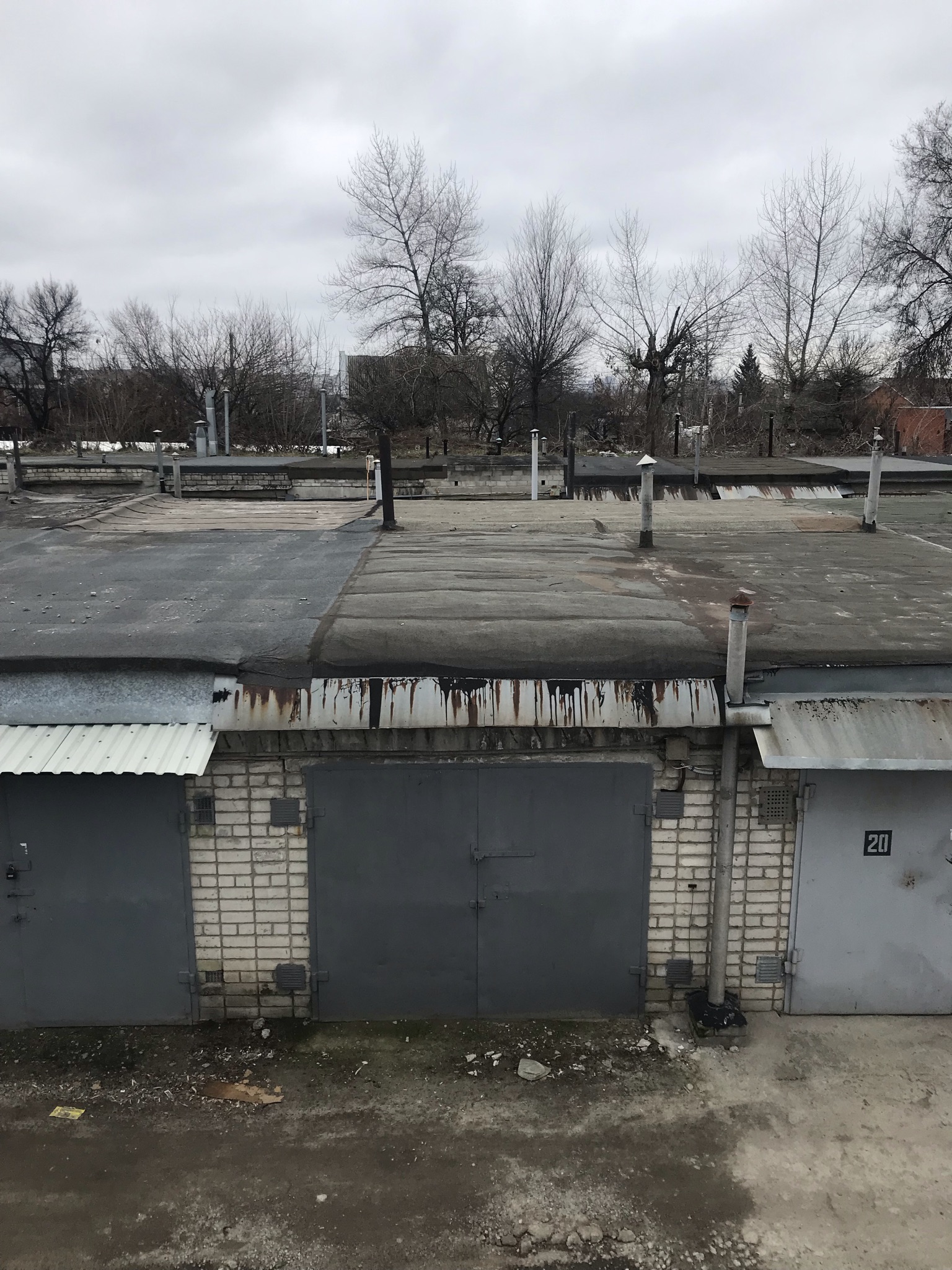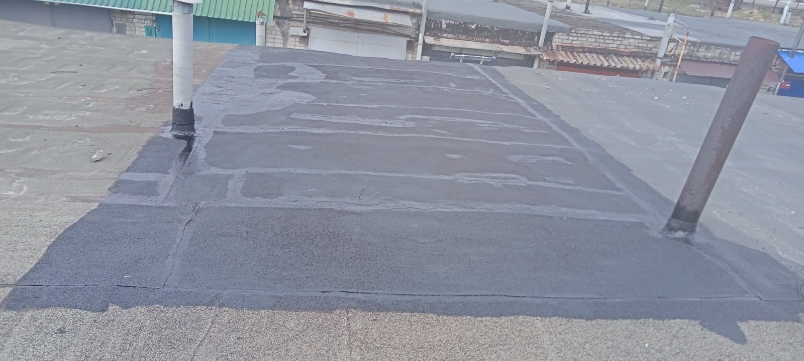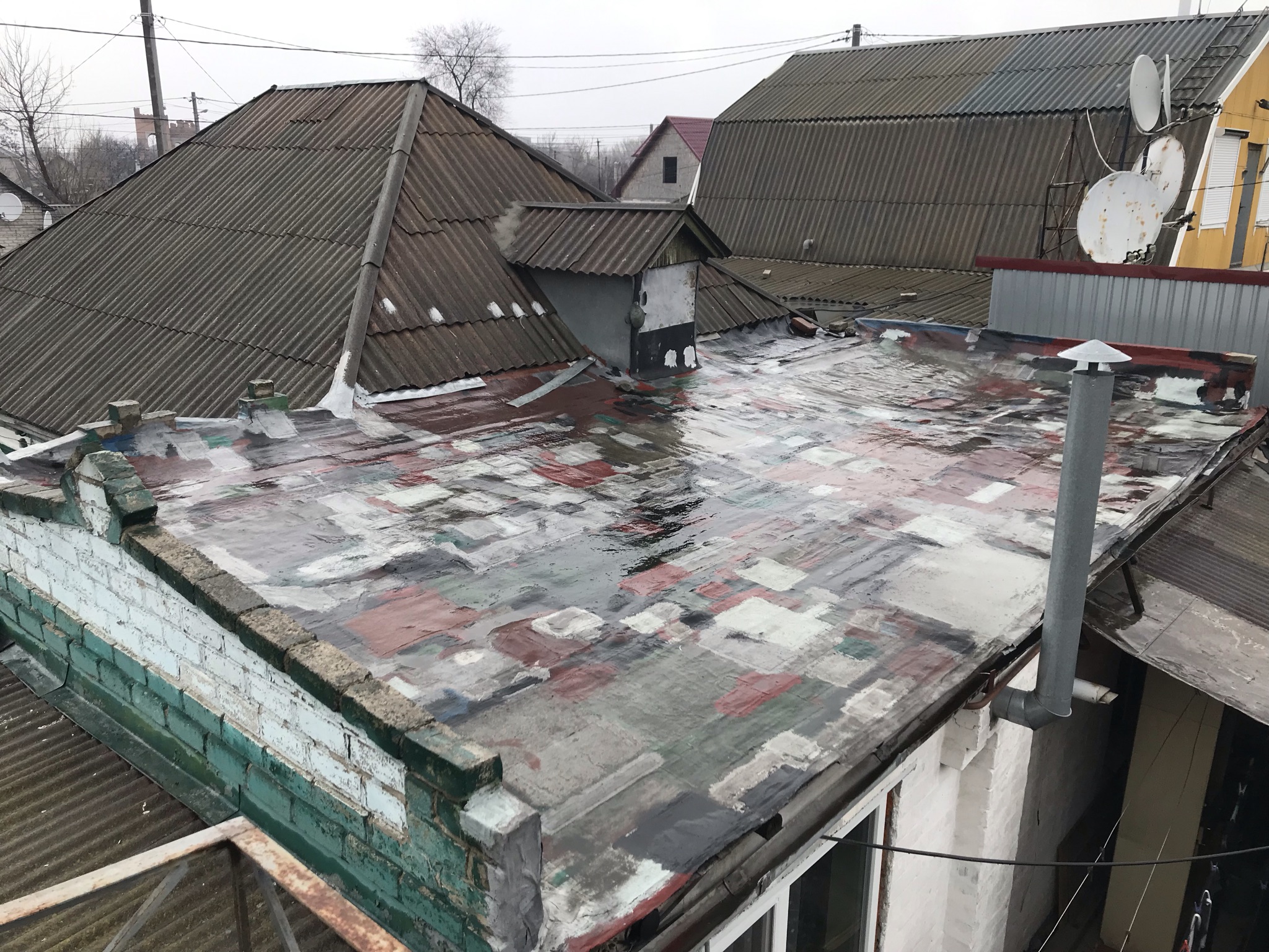 Кровля крыши на гараже: очистка поверхности, праймеровка поверхности, монтаж козырька, укладка наплавляемого руберойда. Площадь кровли 30 м 2 (Днепр, АНД район). Апрель 2023 г.