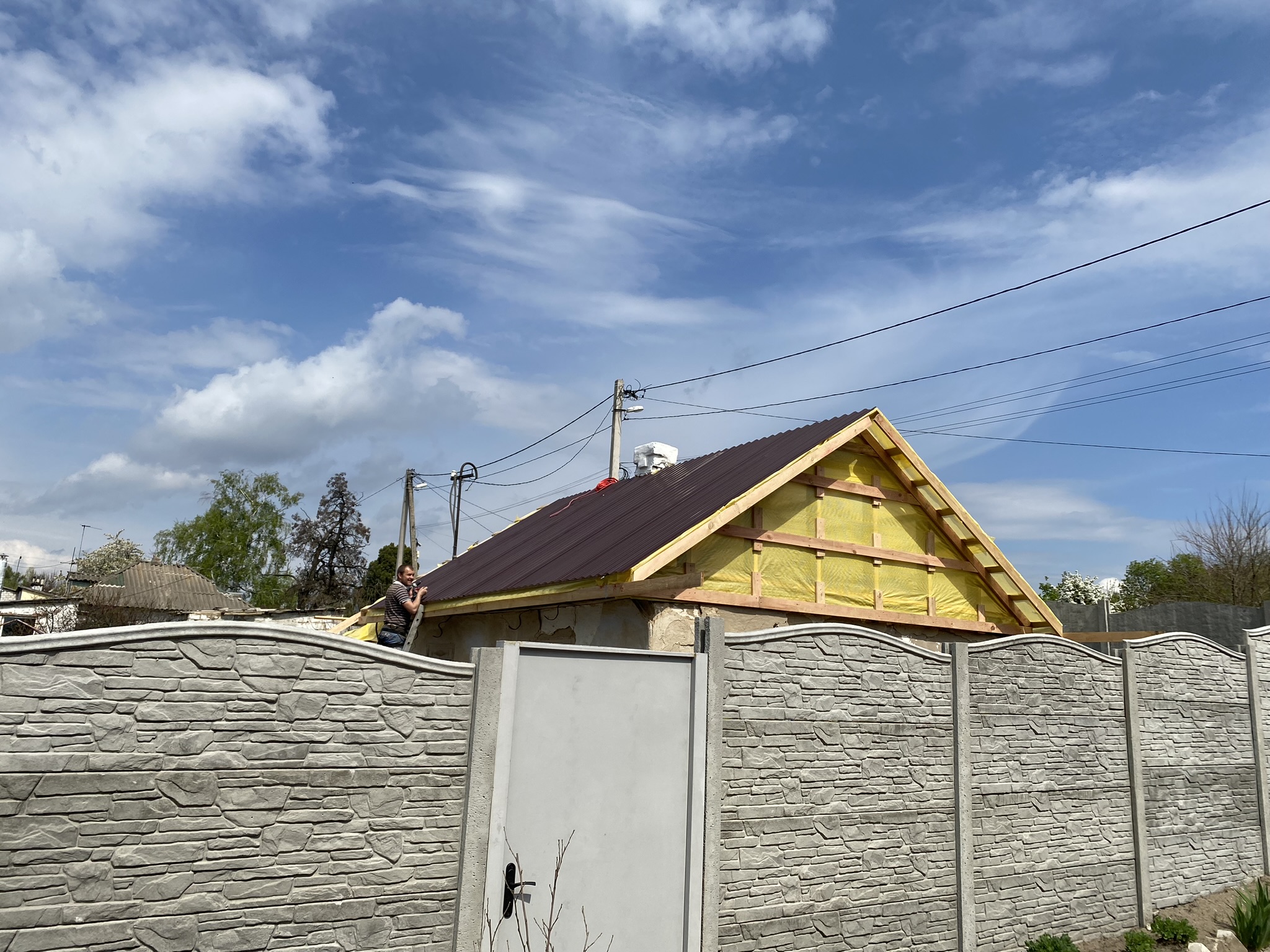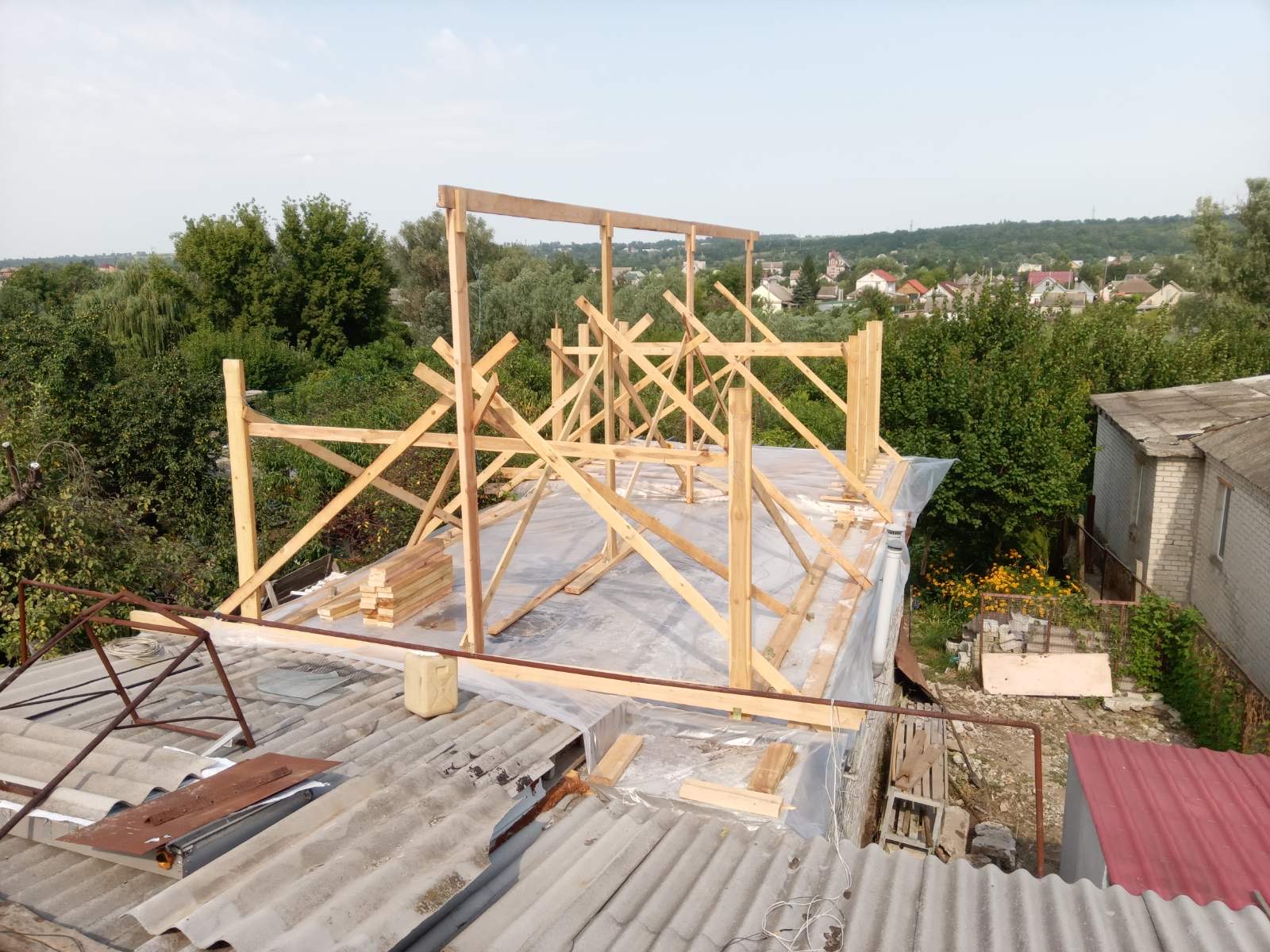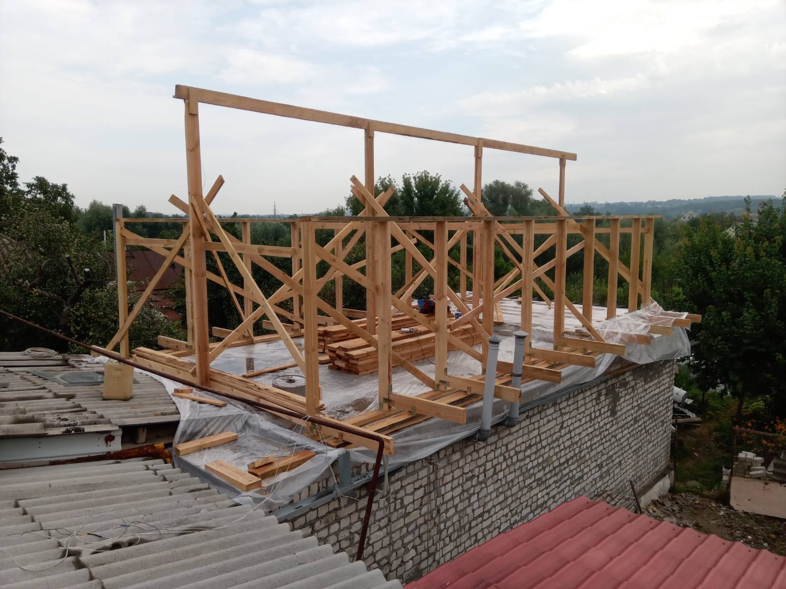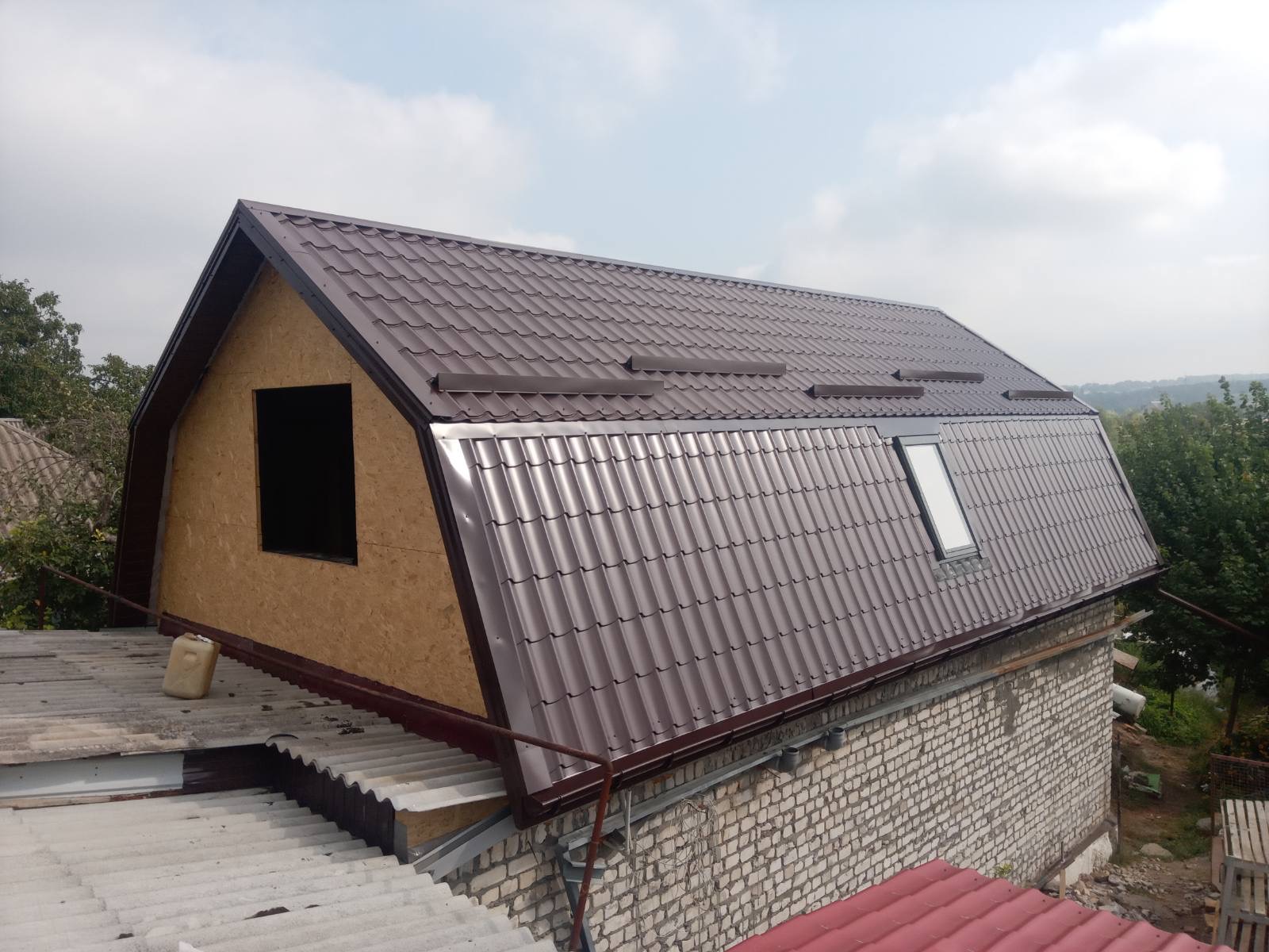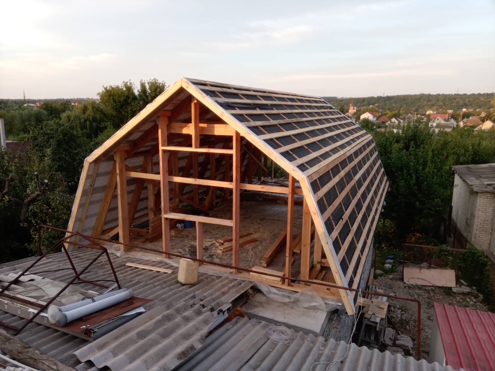 Строительство мансардного этажа: монтаж стропильной системы, монтаж гидроизоляции, монтаж обрешётки, монтаж мансардных окон, монтаж металлочерепицы, монтаж свесов кровли, монтаж водосточной системы. Общая площадь кровли 120 м 2 (срок выполнения работ 15 – 17 рабочих дней). Днепр, ж / м “Приднепровск”. 2021 год