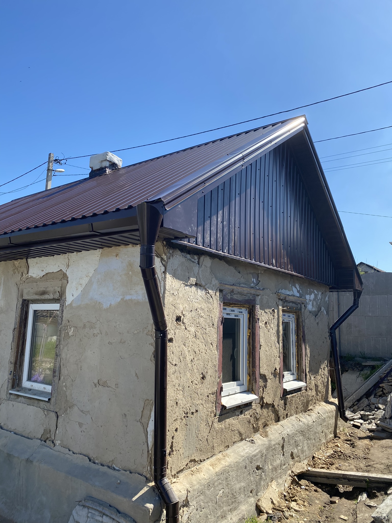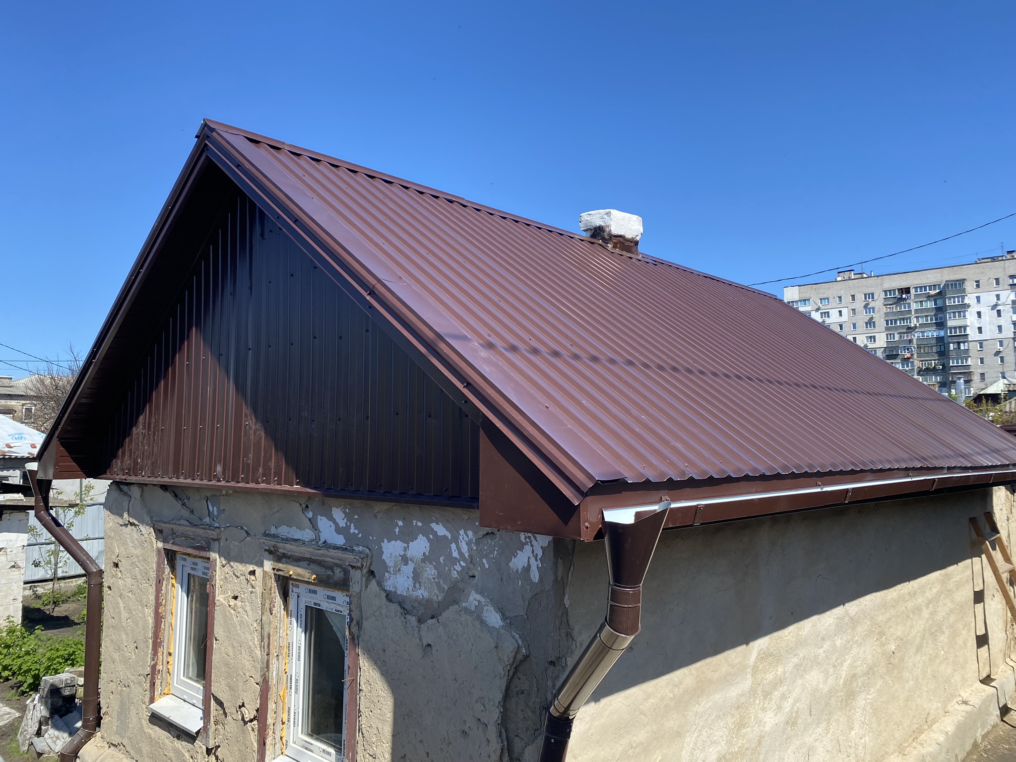 Кровля крыши частного дома: демонтаж шифера, демонтаж старой обрешётки, ремонт стропильной системы, монтаж гидроизоляции, монтаж новой обрешётки, монтаж металлочерепицы, монтаж свесов кровли, монтаж водосточной системы. Общая площадь кровли 184 м 2 (срок выполнения работ 16 – 18 рабочих дней). Днепр, ул. Сташкова. 2021 год
